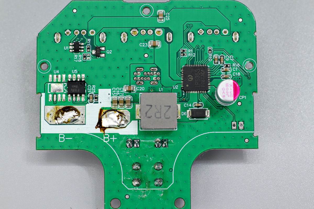 PCB板另一面一覽,設有濾波電容、移動電源主控芯片、升降壓電感、鋰電保護芯片等元件。