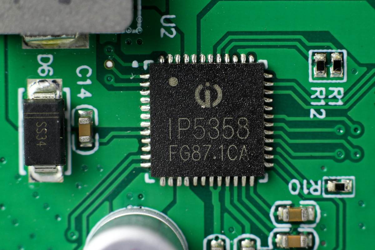 移動電源主控芯片采用英集芯IP5358,這是一款集成QC2.0/QC3.0/SCP/VOOC輸出快充協議、FCP/AFC/SFCP輸入輸出快充協議、MTK PE+1.1&2.0輸出快充協議、USB PD2.0/3.0輸入輸出協議、USB PD3.0 PPS輸出協議、兼容BC1.2/蘋果/三星手機。