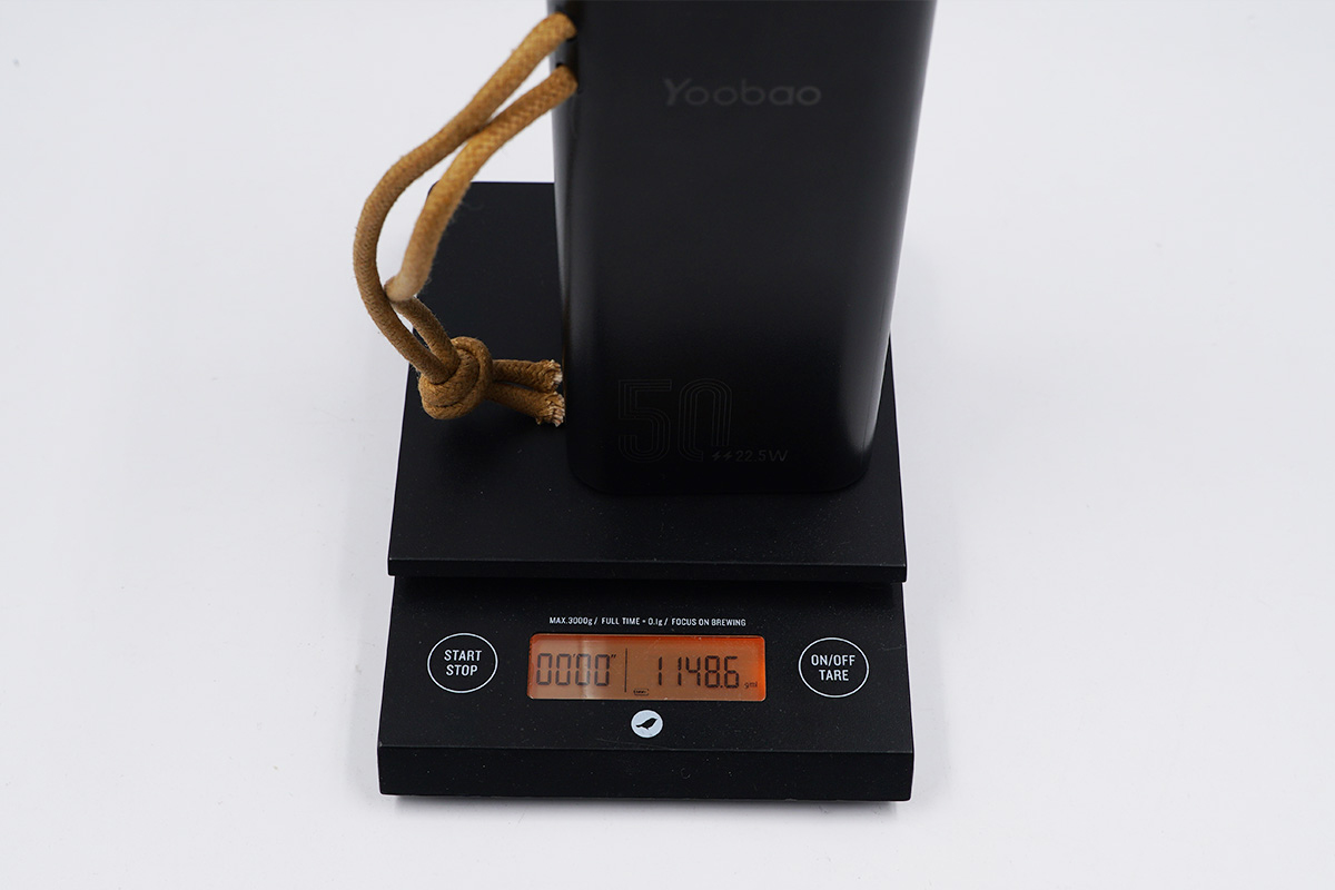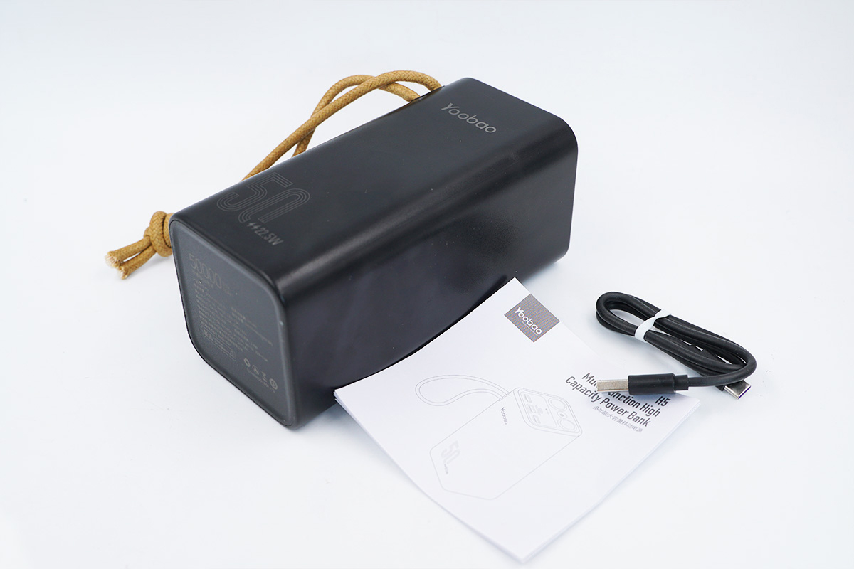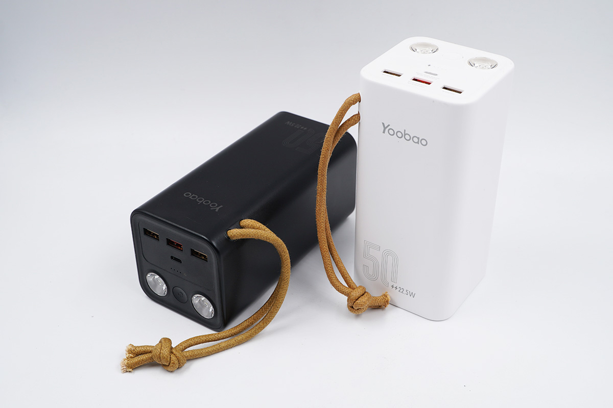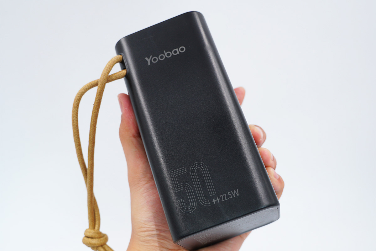移動電源采用方柱造型設計,全身采用PC阻燃材質塑料外殼,表面磨砂處理,腰身各面之間過渡圓潤,正面印有YOOBAO品牌,50/22.5W藝術字體表面容量和功率。