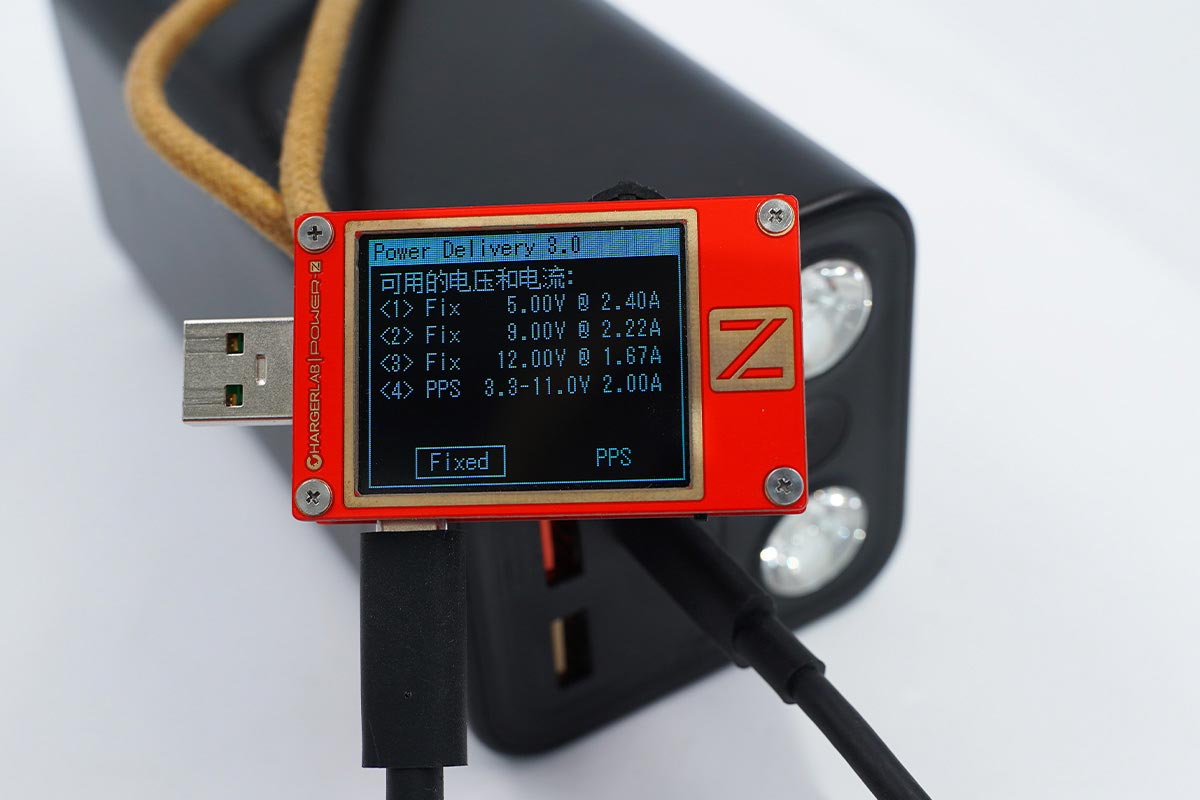 使用ChargerLAB POWER-Z KT002測得USB-C口支持Apple 2.4A、Samsung 5V2A、DCP協議,以及QC2.0/3.0、AFC、FCP、PD3.0、PPS快充協議。