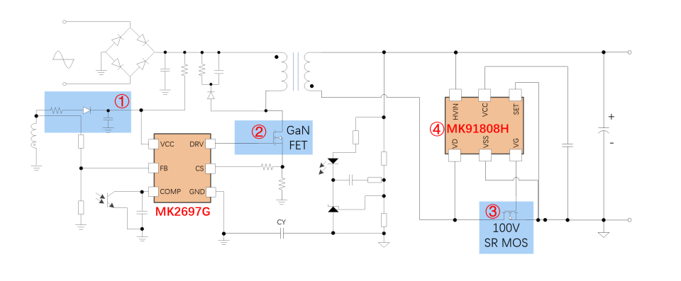 茂睿芯量產發布的高精簡低成本65W GaN快充方案,具有小體積、高效率的優勢。原邊PWM控制芯片MK2697G,Vcc 耐壓110V,無需外部穩壓電路,采用專利驅動技術,直驅GaN功率器件,有效的提高了產品效率及功率密度;搭配業界超短關斷延時SR MK91808H,可選用更低耐壓等級的同步整流MOSFET,獲得更低的BOM成本。 65W直驅GaN方案優勢: ① MK2697G 110V Vcc 耐壓,支持3.3V-20V Vout,無需外部穩壓電路 ② MK2697G 直驅GaN,外圍簡潔 ③ MK2697G 專利軟驅技術,副邊MOSFET應力低 ④ MK91808H 支持1MHz開關頻率