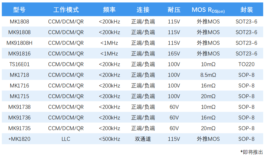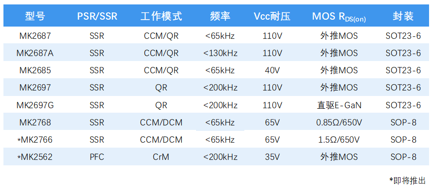 65W PD直驅GaN方案性能特點: 重載輕載,原邊MOSFET均在谷底開通。 ??整個PPS(Vout: 3.3V-20V)輸出過程,MK2697G Vcc電壓都在額定工作范圍內。 專利技術,配合業界超短關斷延時SR,同步整流管采用100V MOSFET足以應對各種故障狀態。265V ac輸入,輸出短路條件下,SR MOSFET VDS電壓最高僅91V。 二、茂睿芯AC-DC產品系列 ?針對PD/QC等快充方案變電壓輸出的特性,茂睿芯陸續推出多款寬Vcc范圍的ACDC解決方案,為客戶節省掉傳統方案中的Vcc穩壓電路,減小布板空間,使用更靈活。獨特的專利技術,可減小副邊功率管VDS應力,優化BOM成本。 三、?品類完整,技術領先的同步整流產品系列 針對GaN高頻應用的特性,茂睿芯陸續推出支持高頻應用的同步整流產品: MK91808H和MK91816,至此茂睿芯的同步整流產品將基本覆蓋1MHz以下的所有Fly-back應用,后續還將推出支持LLC工作方式的同步整流方案。 更多茂睿芯產品和服務信息,可訪問茂睿芯公司官網或微信公眾號(茂睿芯科技)查詢,也歡迎來電咨詢。 郵箱:?sales@meraki-ic.com 網址:?www.meraki-ic.com 電話:0755-21650039