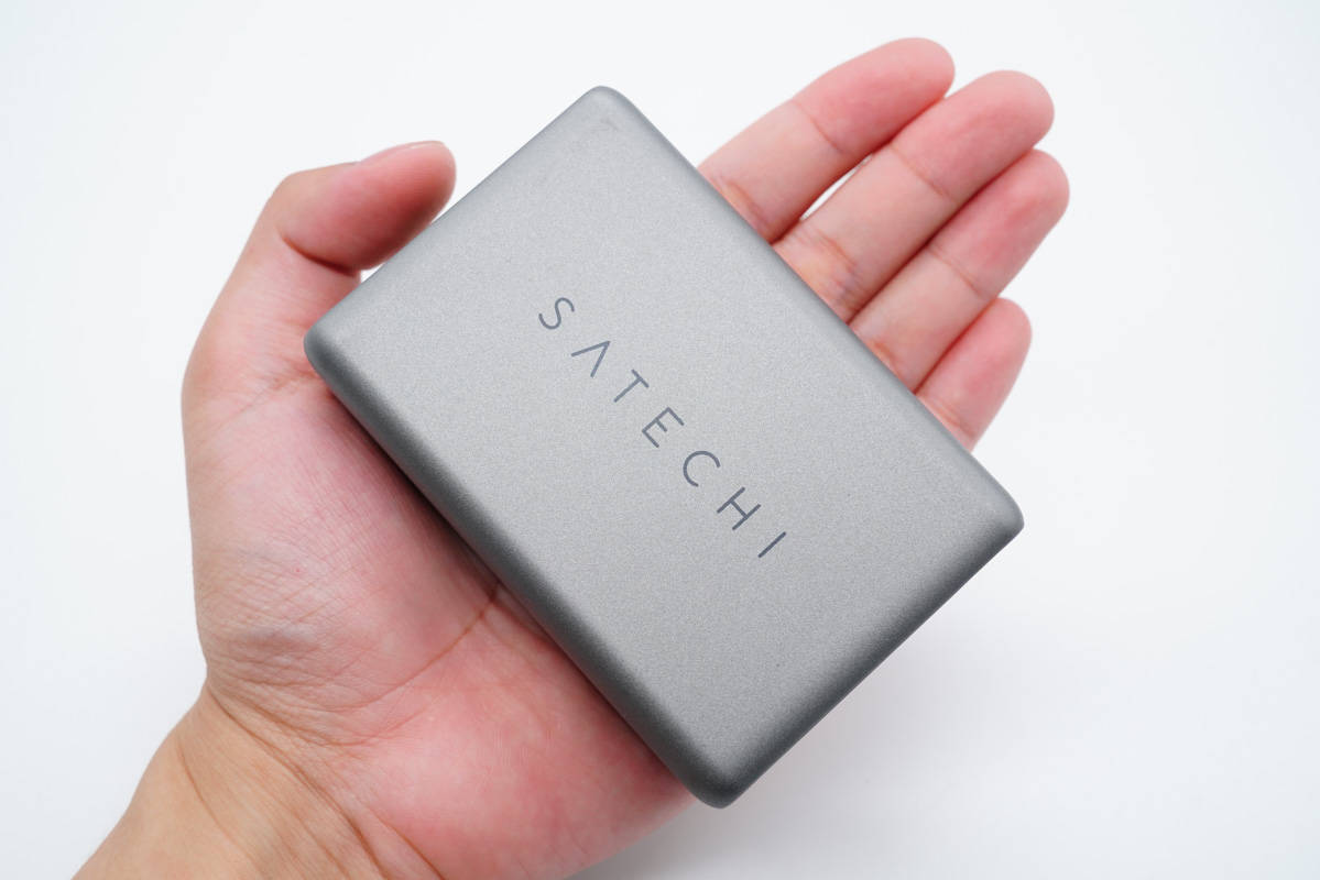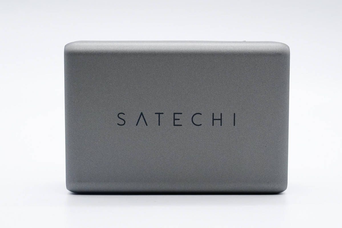 這款氮化鎵充電器主體呈灰色,機(jī)身扁平,表面磨砂處理,邊角過渡圓潤,頂面印有SATECHI 品牌。