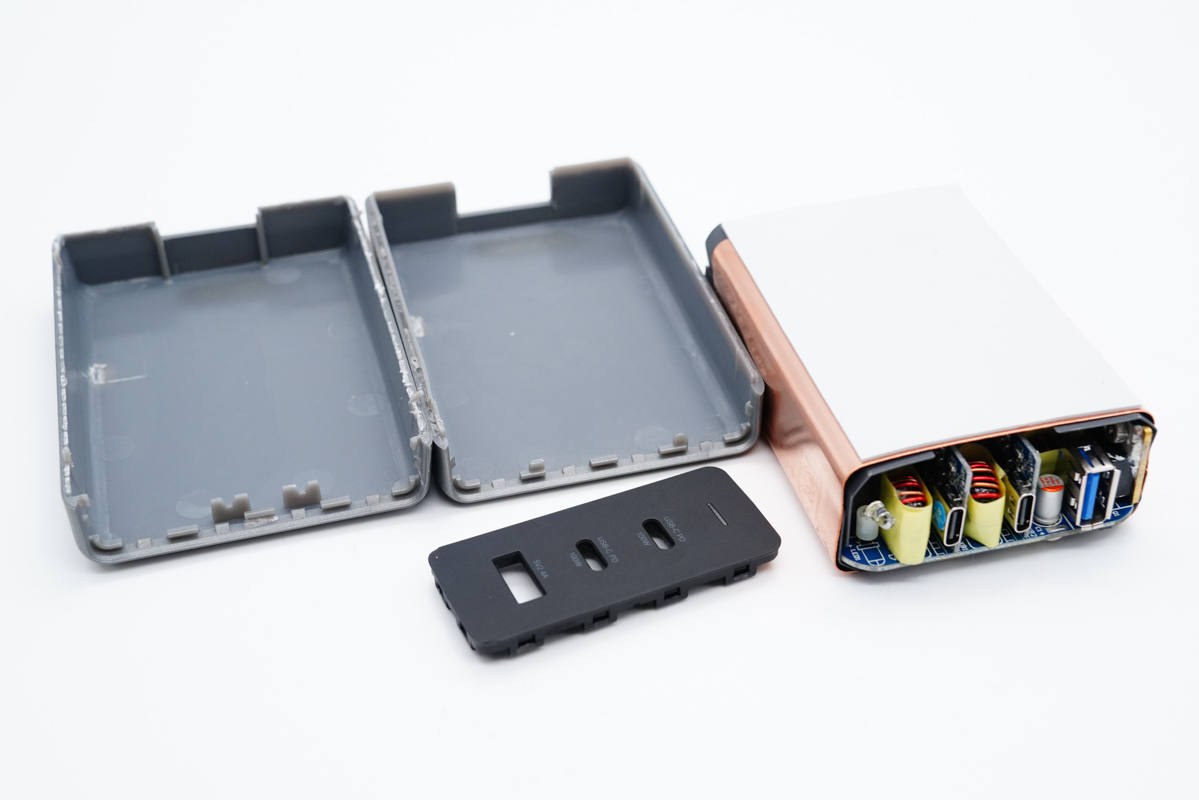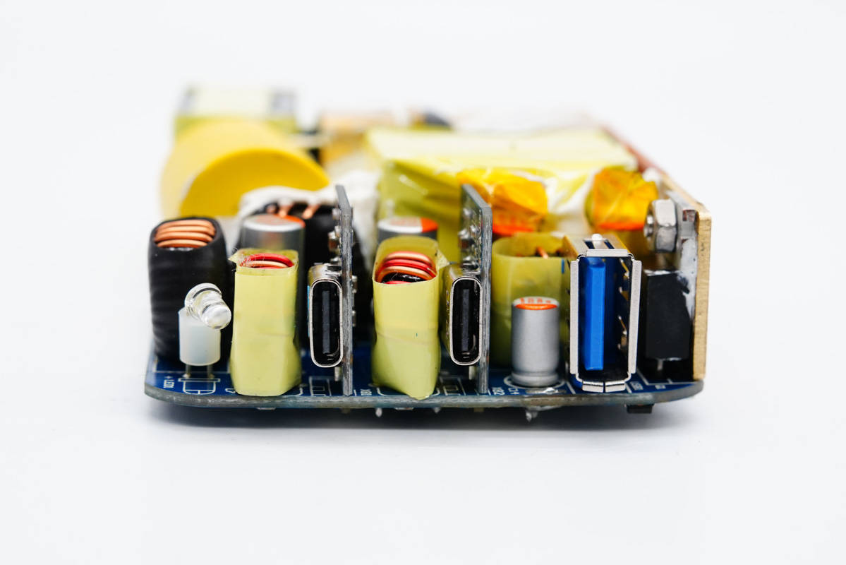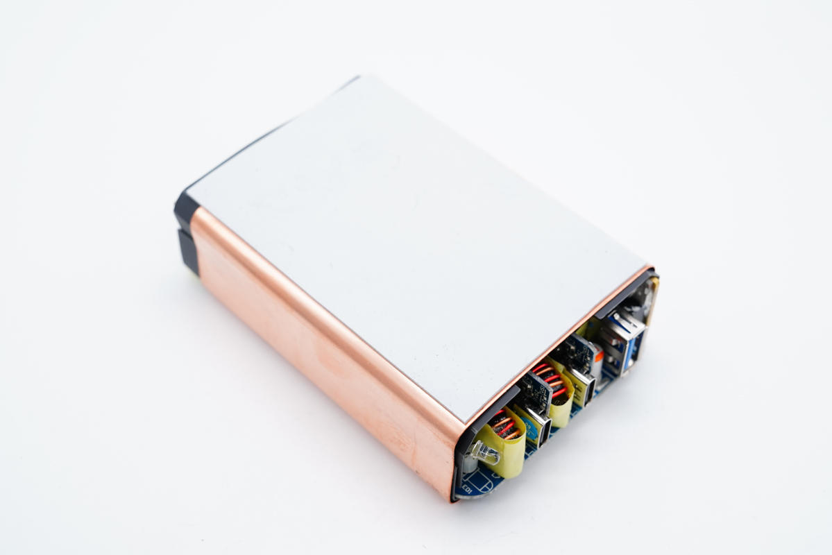 雙C口均采用德信EUP3268B搭配威兆和泰德MOS管進(jìn)行二次降壓,由慧能泰協(xié)議芯片HUSB350控制輸出電壓;USB-A口采用英集芯IP6503S進(jìn)行二次降壓以5V恒壓輸出。電路板整個使用銅片包裹均熱,并在電路板正反面設(shè)有導(dǎo)熱貼傳導(dǎo)至外殼散熱,降低溫升。內(nèi)部元件全部打膠填充固定,穩(wěn)定可靠。