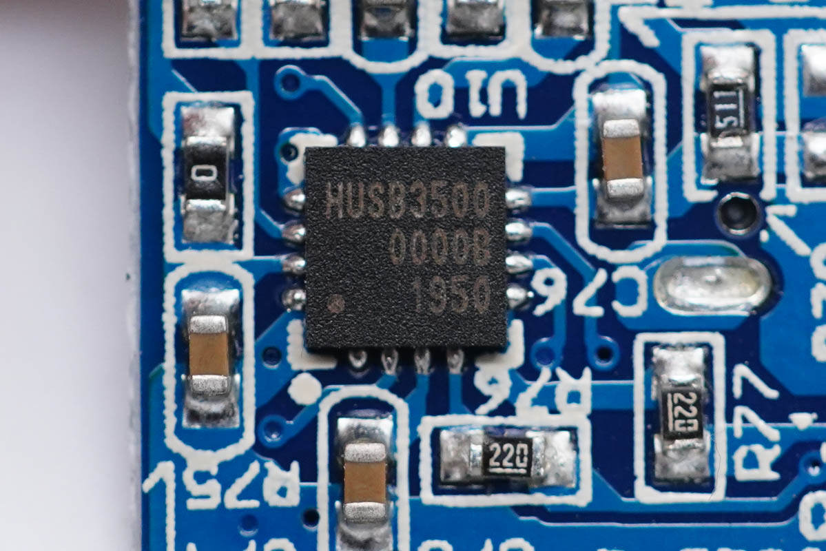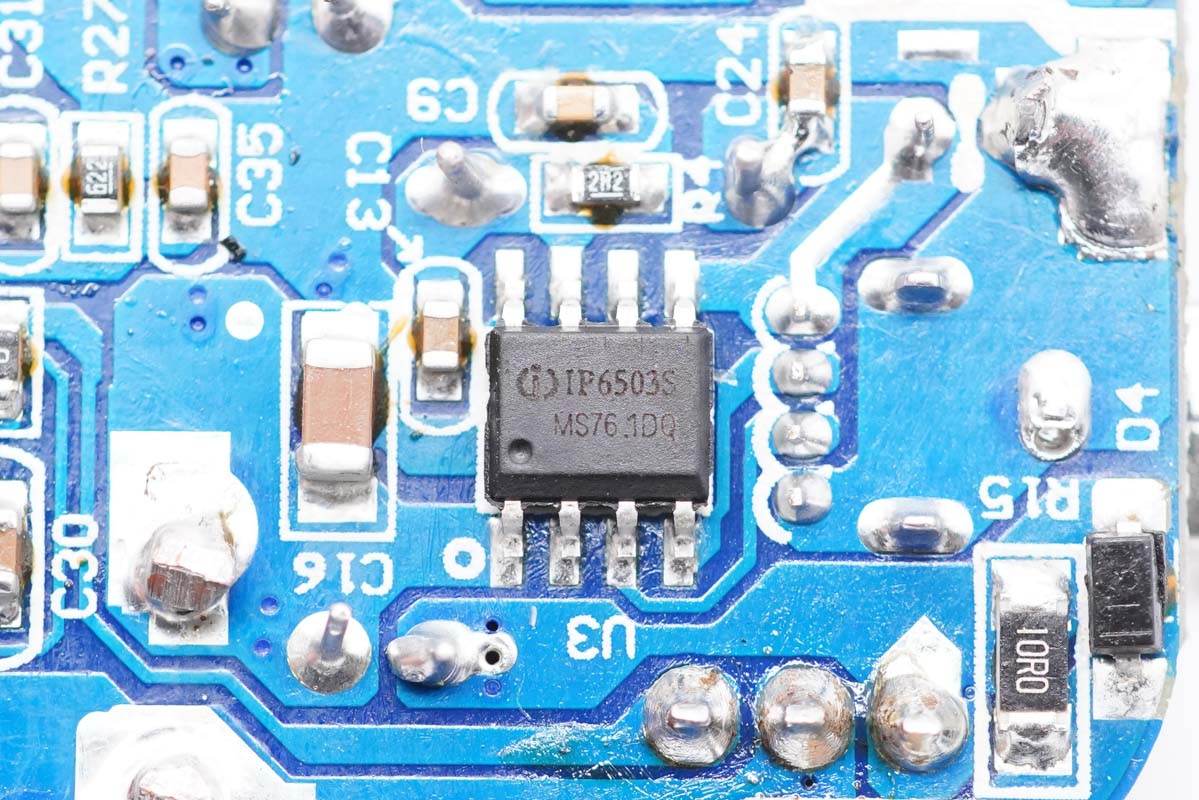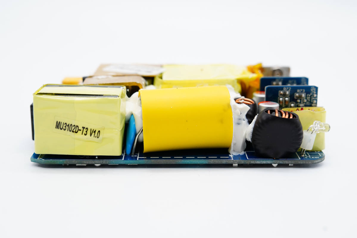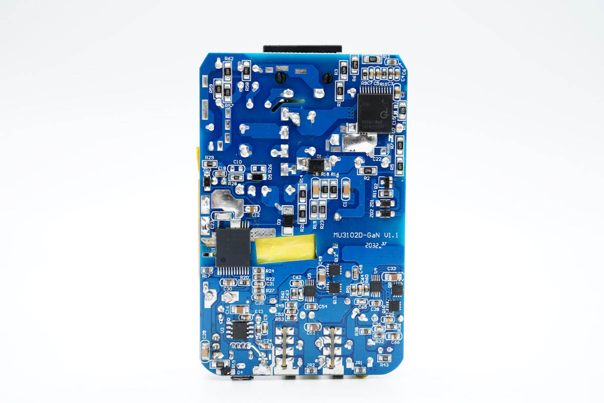 雙C口均采用德信EUP3268B搭配威兆和泰德MOS管進(jìn)行二次降壓,由慧能泰協(xié)議芯片HUSB350控制輸出電壓;USB-A口采用英集芯IP6503S進(jìn)行二次降壓以5V恒壓輸出。電路板整個使用銅片包裹均熱,并在電路板正反面設(shè)有導(dǎo)熱貼傳導(dǎo)至外殼散熱,降低溫升。內(nèi)部元件全部打膠填充固定,穩(wěn)定可靠。