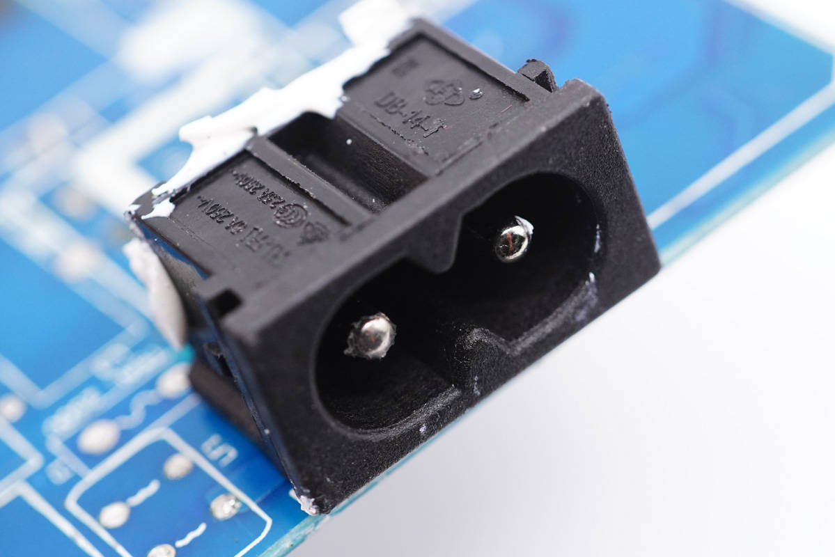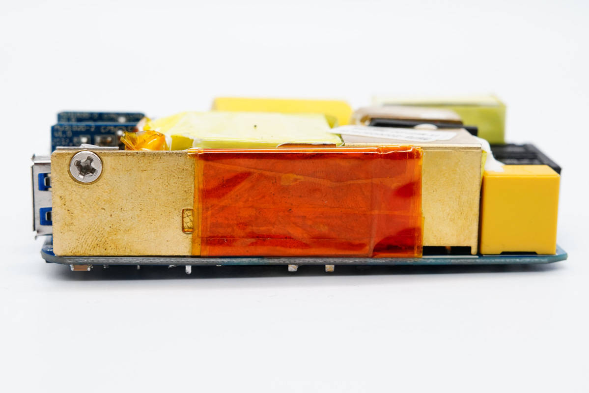 PCB板正面一覽,輸入端元器件間的縫隙填充硅膠加固,此外還配有黃銅散熱片幫助整流橋、次級同步整流管等發(fā)熱器件散熱。
