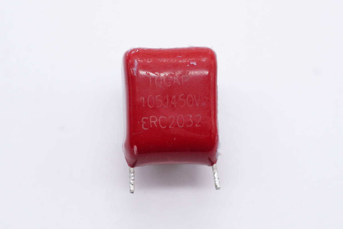 紅色薄膜電容特寫,105J450V,用于整流后濾波。