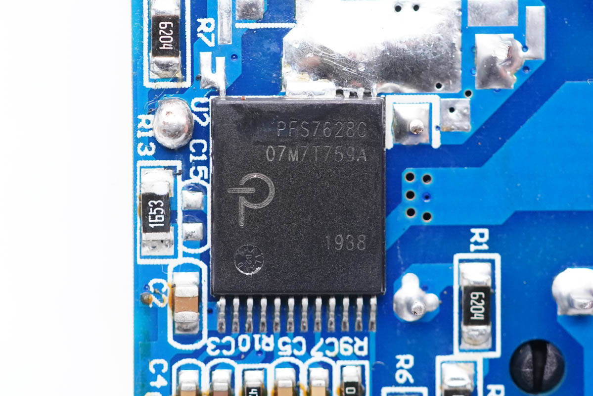 充電頭網(wǎng)通過拆解了解到,作為一款100W大功率充電器,其設(shè)有PFC升壓電路,并采用PI PFS7628C控制;開關(guān)電源由PI高集成主控芯片SC1936C搭配華潤微同步整流管組成;兩個C口二次降壓輸出方案完全一樣。