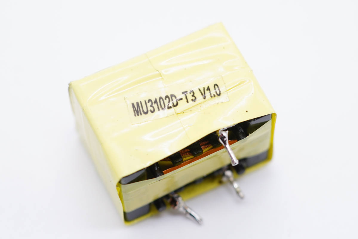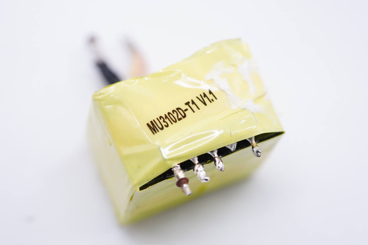 變壓器全身包裹絕緣膠帶,側(cè)面貼有信息標(biāo)簽。