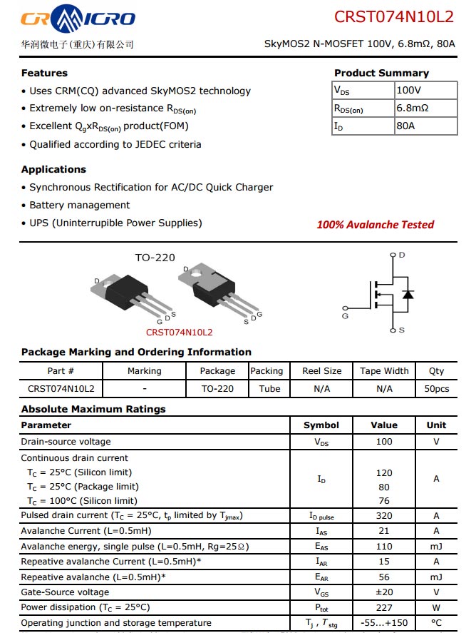 華潤微CRST074N10L2資料信息。