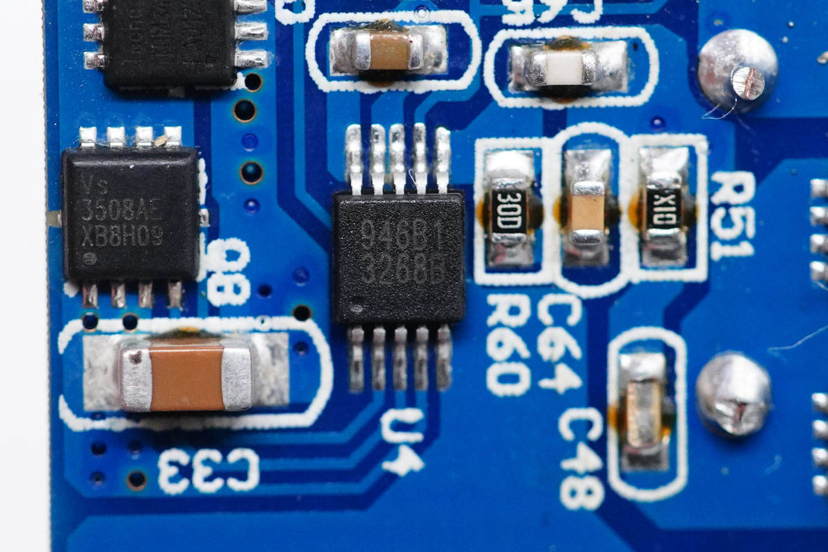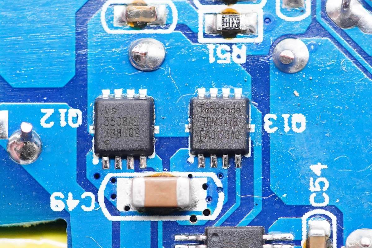 外置開關(guān)管分別是威兆VS3508AE和泰德TDM3478,組成半橋,用于為USB-C口輸出同步整流降壓。