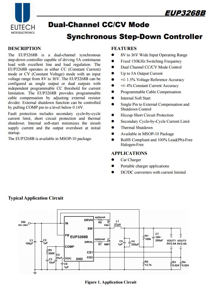 USB-C1口同步整流降壓轉(zhuǎn)換器為德信EUP3268B,支持8-36V寬輸入電壓,最大輸出電流5A,支持可編程的線損補(bǔ)償,支持逐周期電流限制。