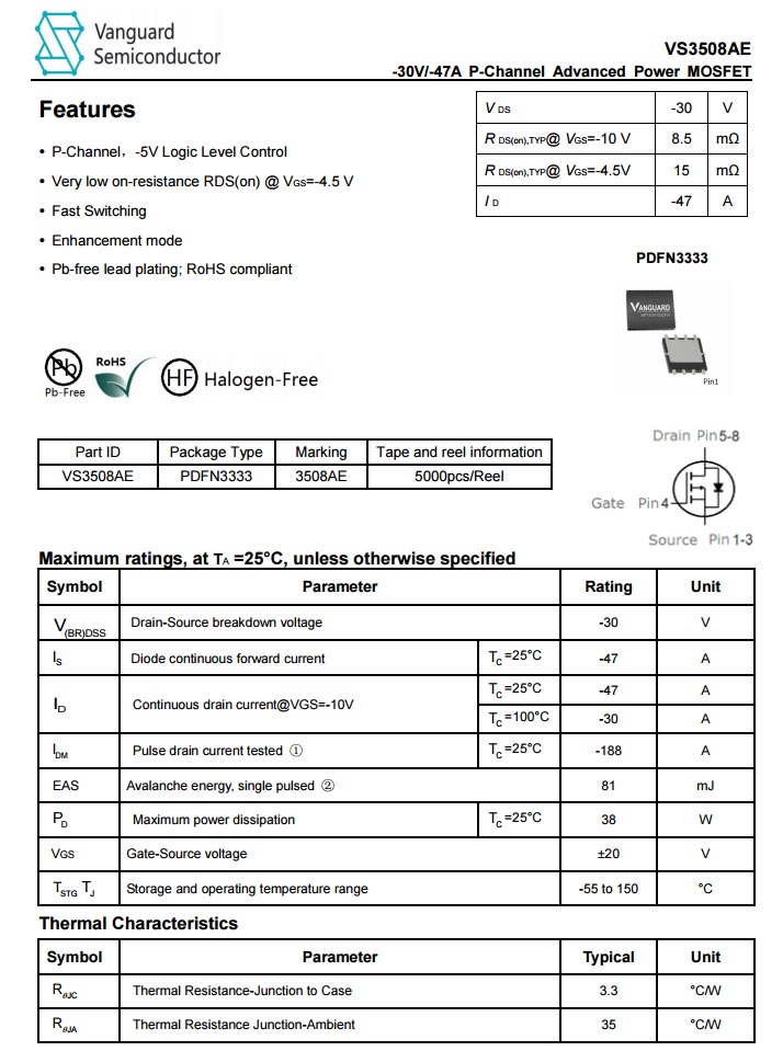 威兆VS3508AE資料信息,PMOS,耐壓30V,PDFN3333封裝。
