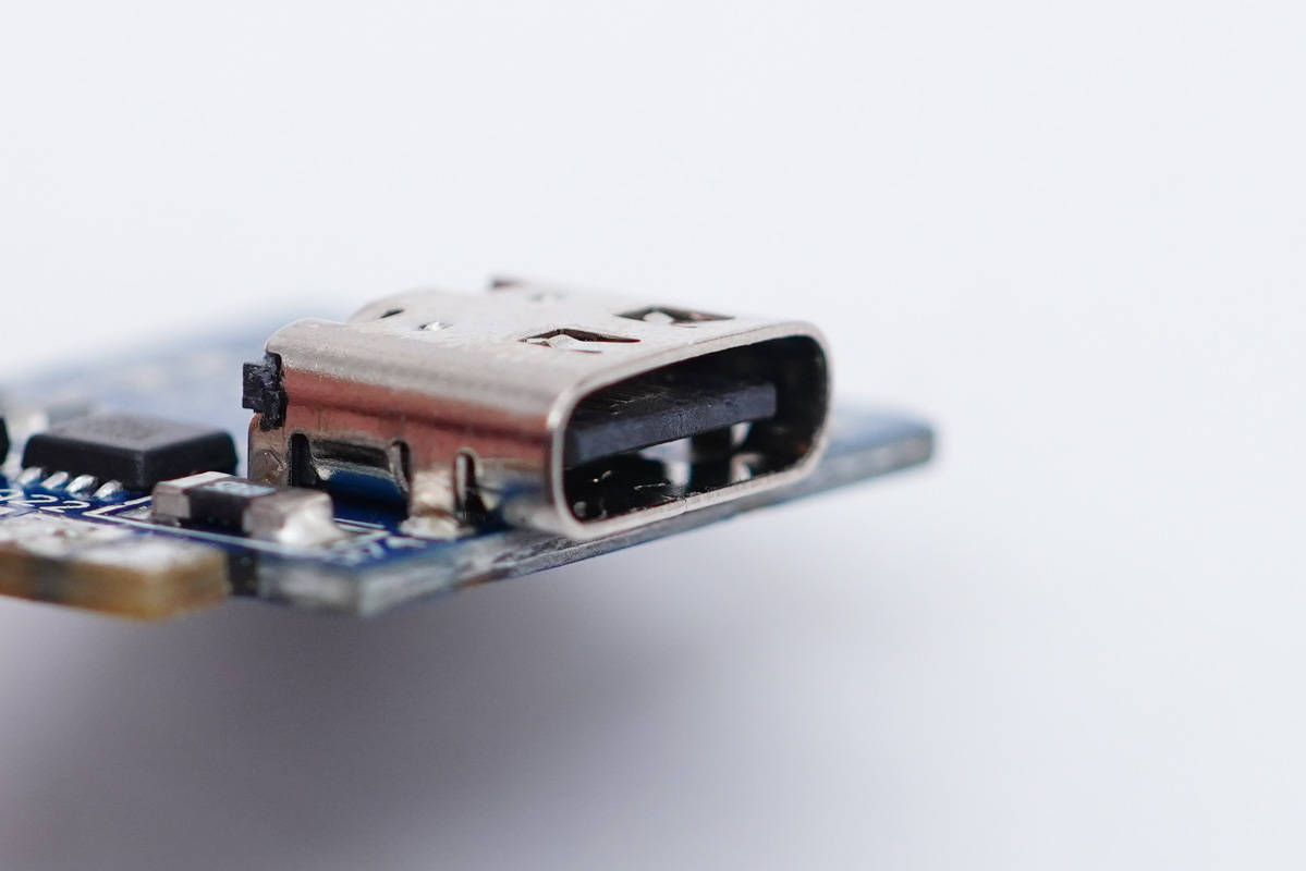 USB-C口母座特寫,過孔焊接。