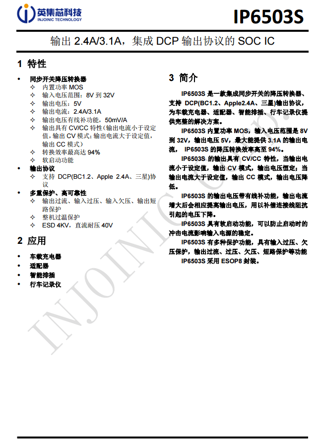 USB-A口降壓協(xié)議IC采用英集芯IP6503S。這是一款集成同步開關(guān)的降壓轉(zhuǎn)換器、 支持 DCP(BC1.2、Apple2.4A、三星)輸出協(xié)議,為車載充電器、適配器、智能排插、行車記錄儀提 供完整的解決方案。?