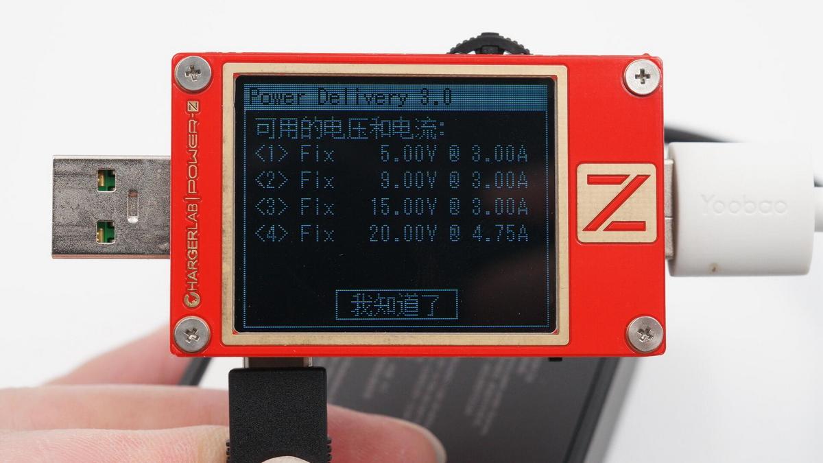 使用ChargerLAB POWER-Z KT002測得充電器支持Samsung 5V2A、DCP和PD3.0協議。