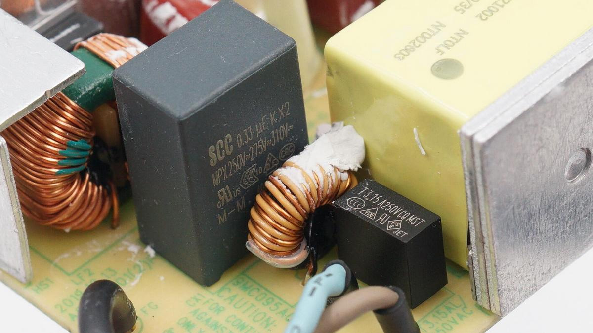 導線旁邊設有延時保險絲、共模電感和X電容。