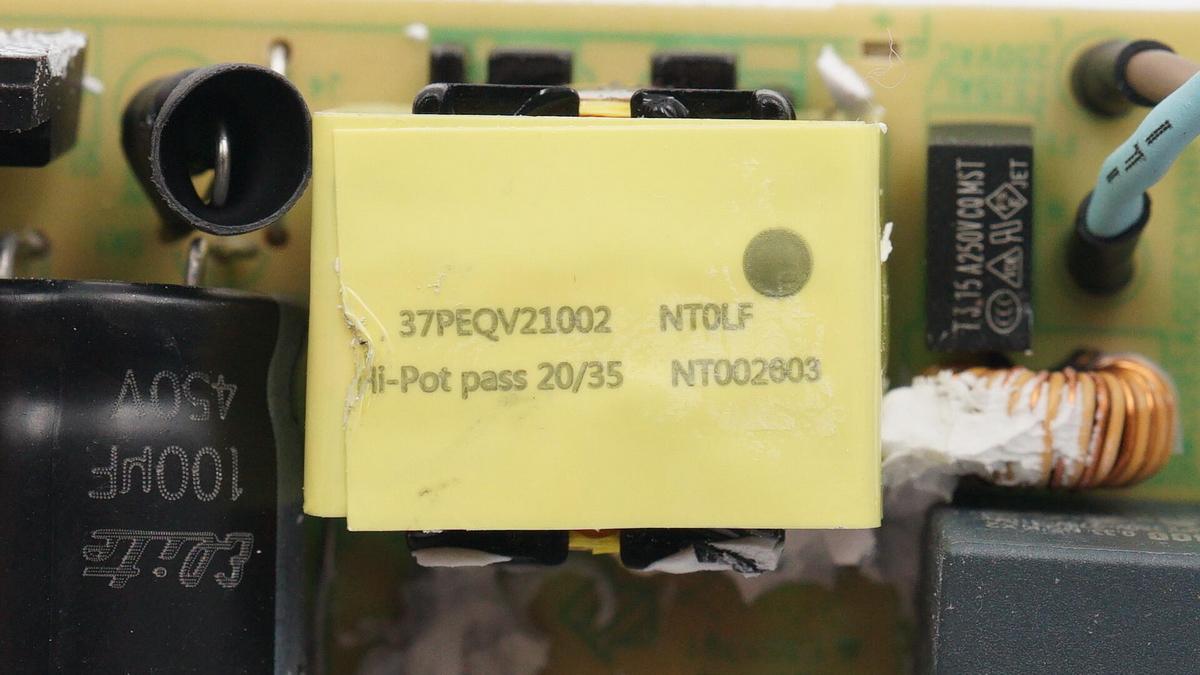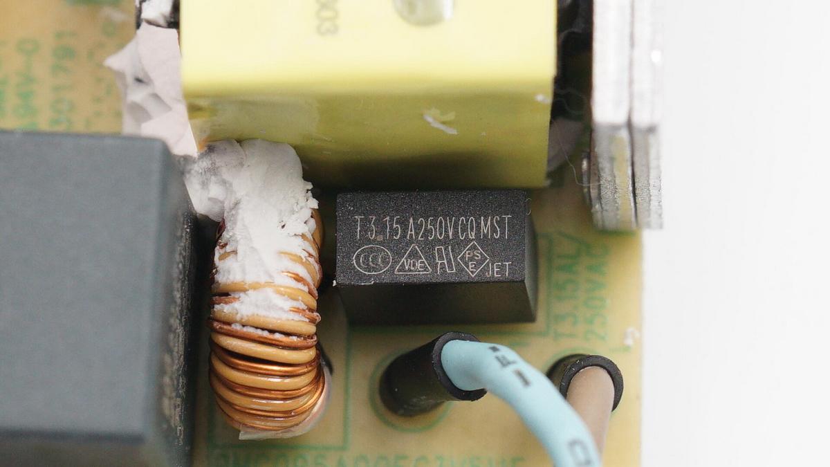 延時保險絲規格為3.15A 250V,共模電感雙線繞制,用于濾除EMI干擾。
