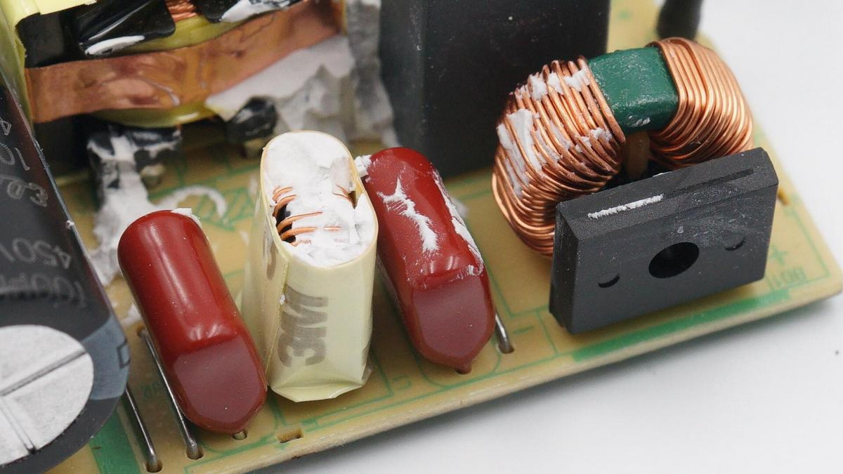 右側則有兩顆紅色薄膜電容以及濾波電感,電感包裹絕緣膠帶。