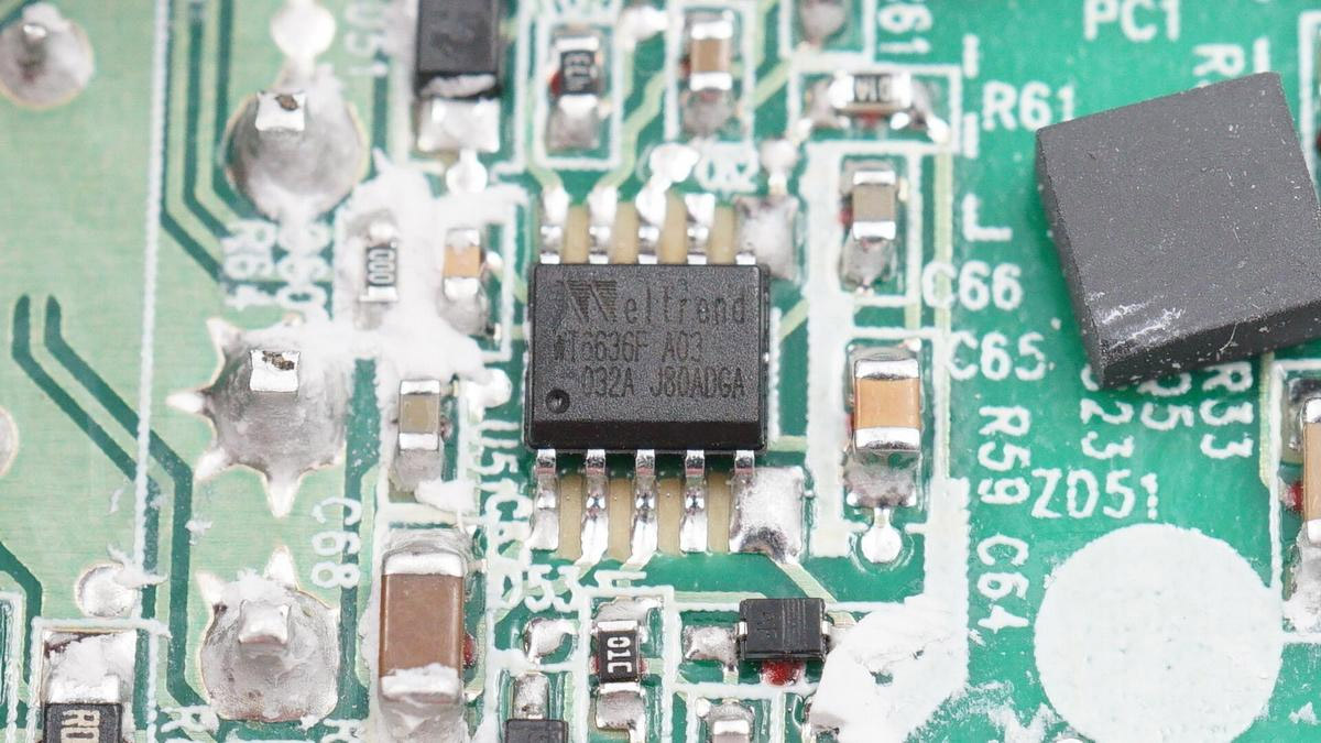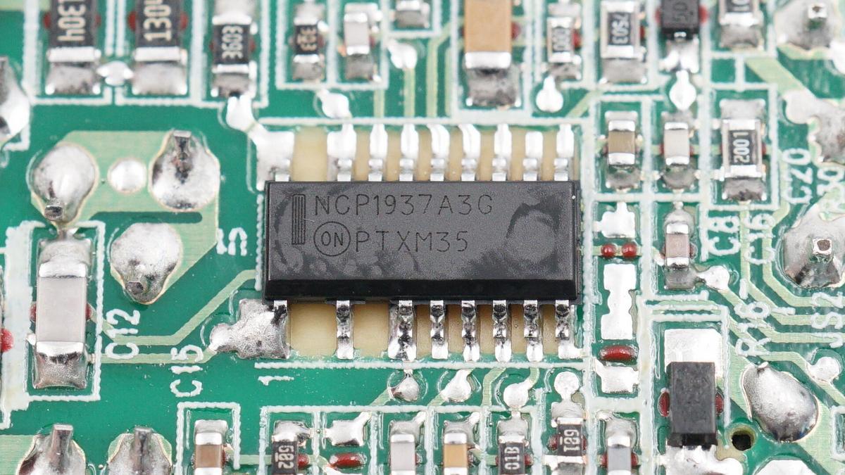 充電頭網通過拆解發現,充電器AC-DC部分,由安森美NCP1937組合控制器搭配英飛凌MOS,以及芯源半導體MP6908搭配富鼎同步整流管組成帶APFC的同步整流開關電源。輸出電壓由偉詮WT6636F控制。輸入輸出濾波電容來自臺灣金山,整體用料非常扎實。