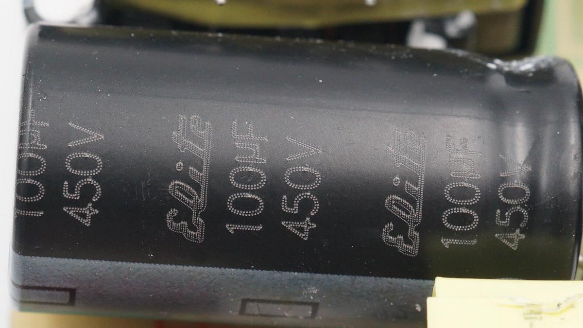 橫置的高壓濾波電解電容來自金山,規格為450V 100μF。