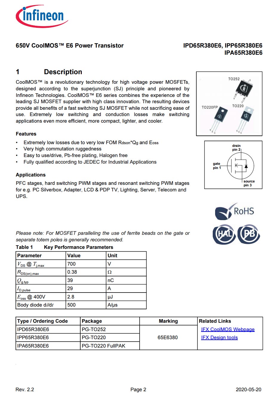 英飛凌 IPP65R380E6 詳細資料。