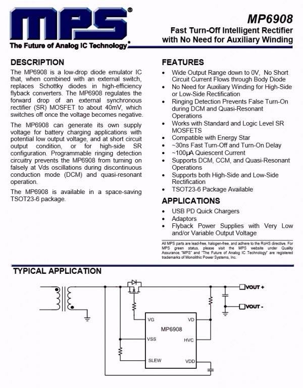 絲印IAZEM次級同步整流控制器,實際是MPS芯源半導體的MP6908,支持寬輸出電壓范圍,支持DCM/CCM/準諧振多種操作模式,支持高側和低側同步整流。