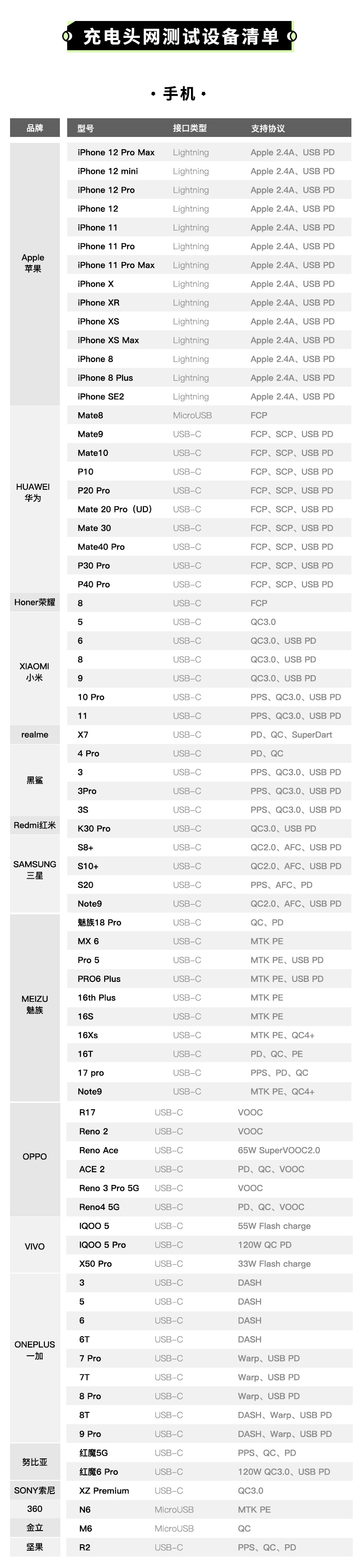 充電頭網評測室目前現有手機75部,品牌包括蘋果、華為、小米、realme、黑鯊、三星、魅族、OPPO、vivo、一加、努比亞等,以上機型基本已經覆蓋手機端絕大部分的快充協議了,包括眾多私有快充,都是可以實際測試得出結論。