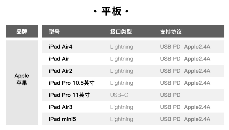 大功率用電設備充電頭網評測室目前現有iPad7款,從iPad mini到iPadOS、從Lightning接口到USB-C接口,協議覆蓋Apple2.4A和USB PD。