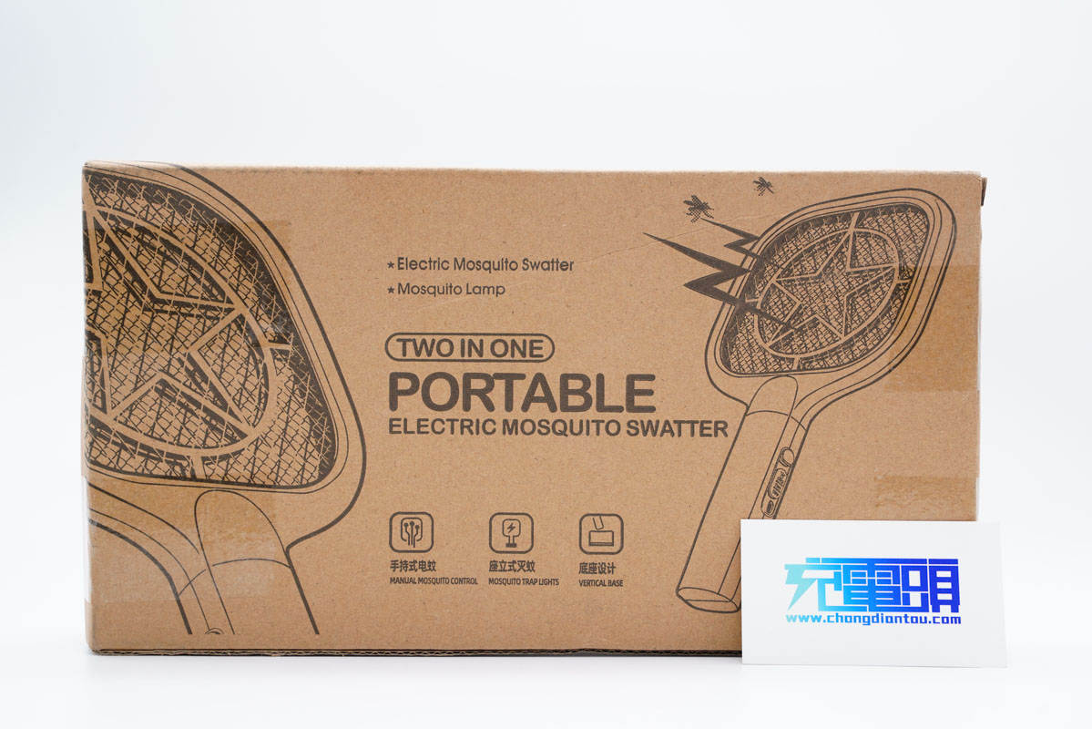 第二款電蚊拍也是采用牛皮紙包裝,正面印有電蚊拍簡(jiǎn)圖及其名稱和三大特性。