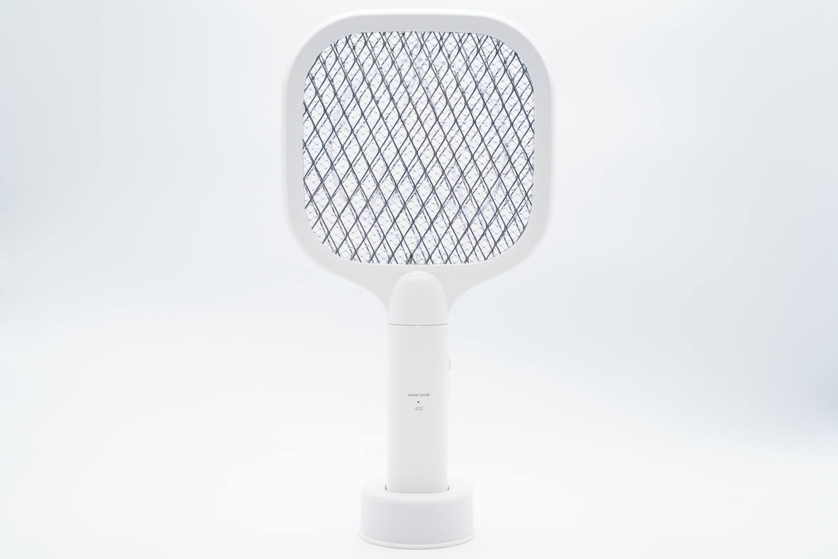 第二款電蚊拍配有一個(gè)底座,插上去即可豎立起來(lái),產(chǎn)品采用白色塑料外殼,網(wǎng)拍為方形設(shè)計(jì)。