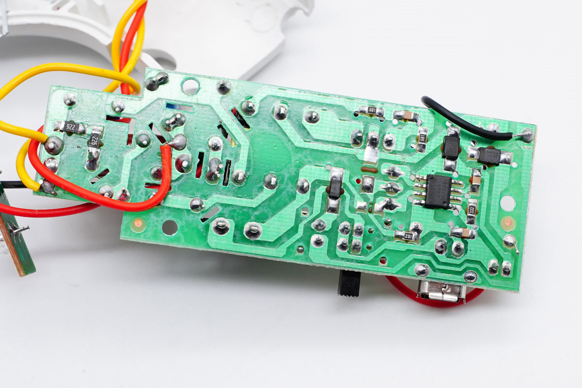 第二款電蚊拍的充電模塊一覽,由于采用了USB直流輸入,沒(méi)有阻容降壓的元件,采用一顆4056為內(nèi)置鋰電池充電。通過(guò)拆解并沒(méi)有鋰電池保護(hù)電路,鋰電池充電的安全性完全依靠充電IC精度。