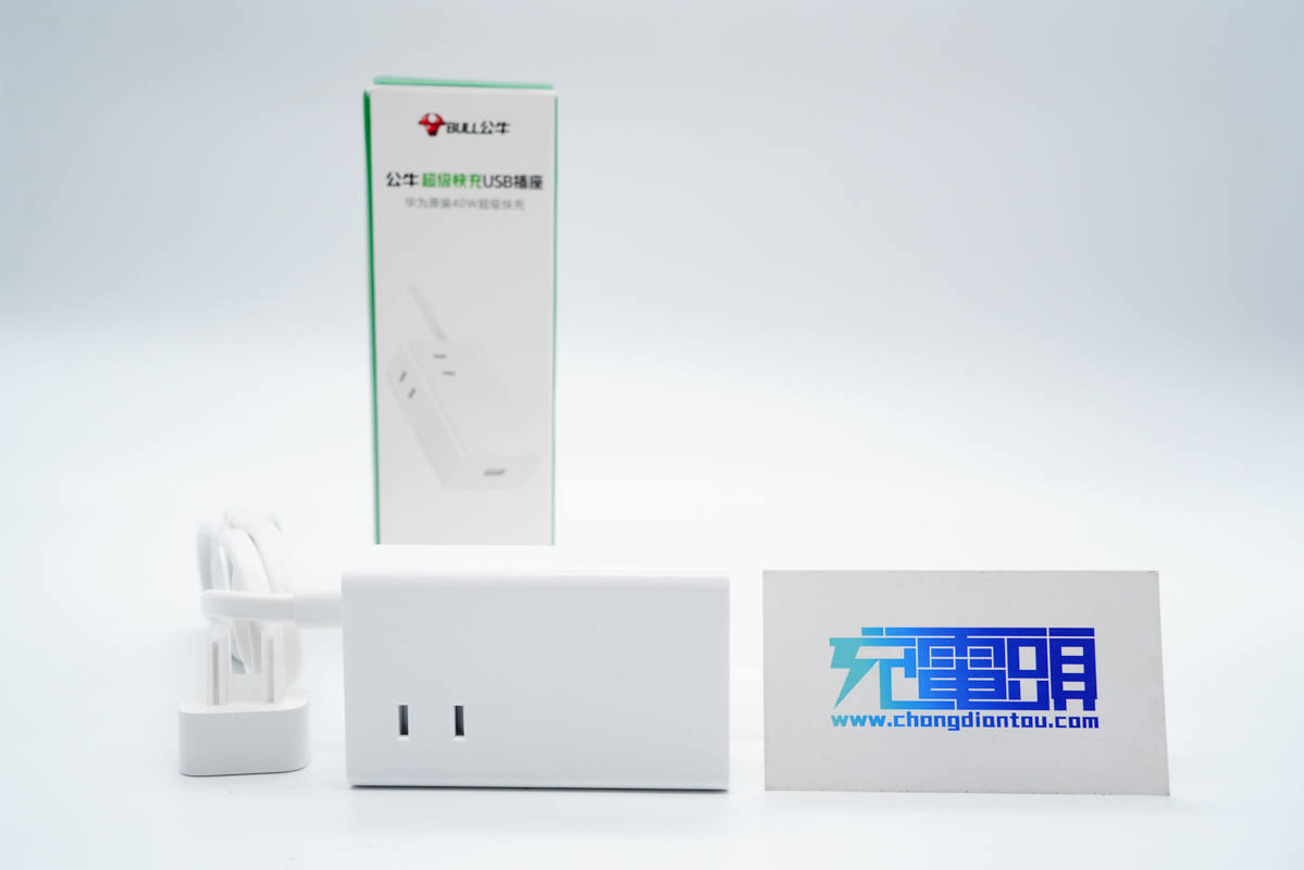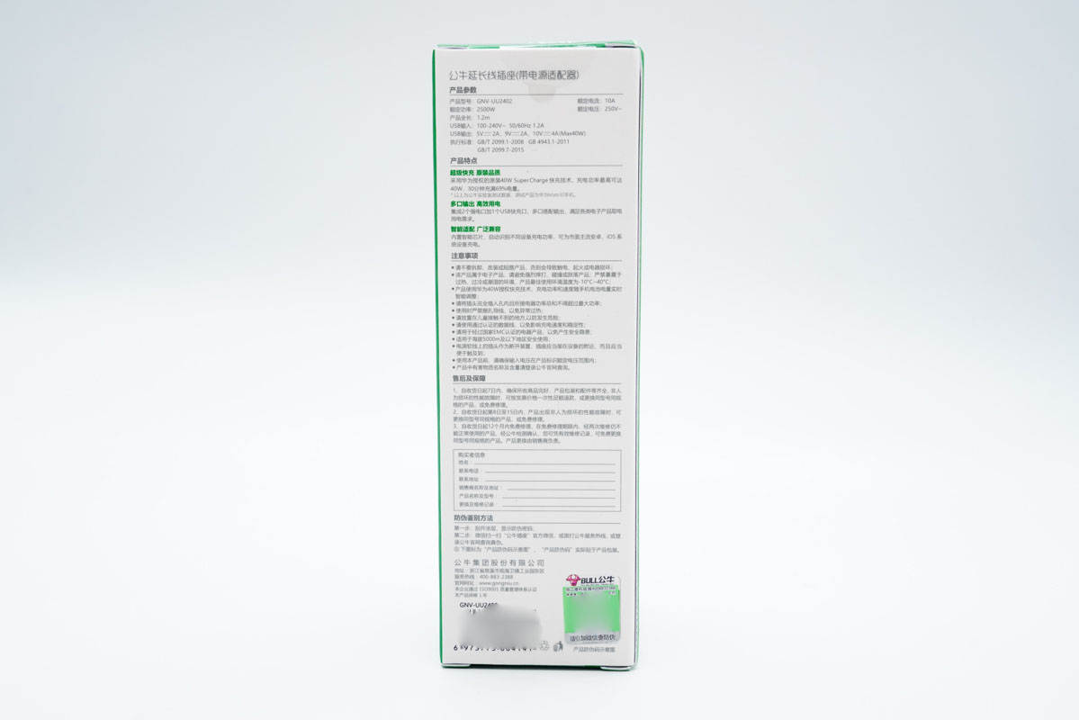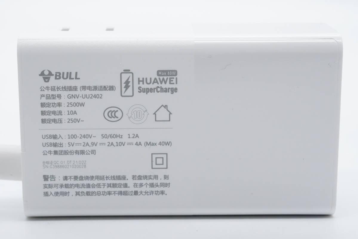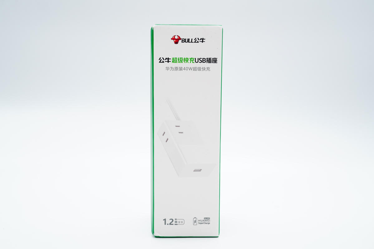 包裝盒采用經典白綠配色,盒子正面印有BULL公牛品牌、產品名稱、外觀圖、1.2米和華為超級快充標識。