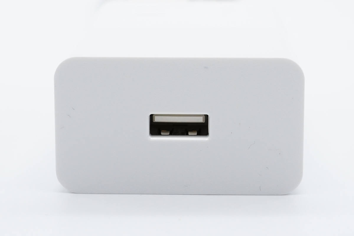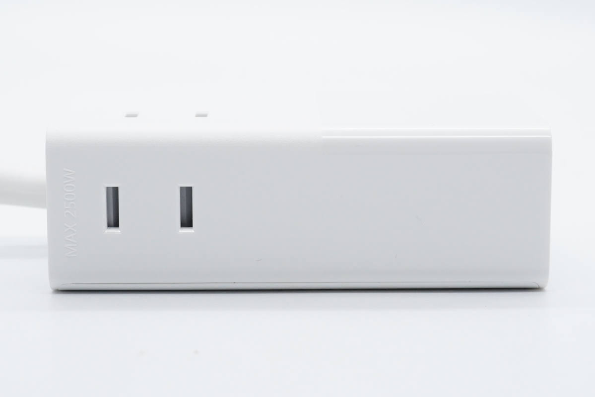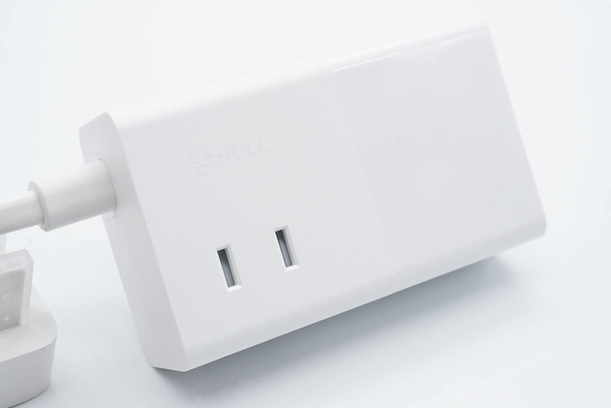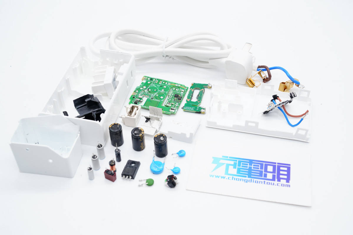兩組AC插孔采用一體銅片設計,充電器模塊外套白色塑料殼。