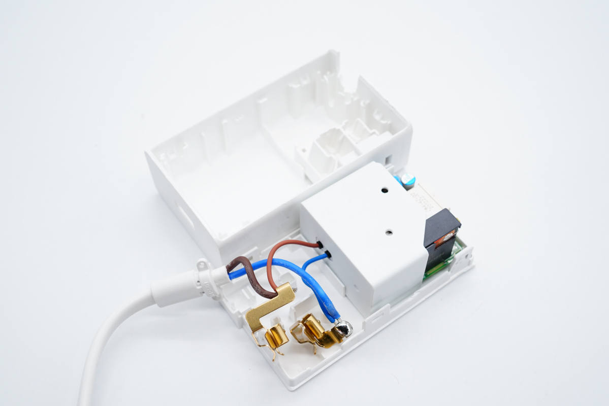 將插座機身殼拆開,采用卡扣進行封裝,電源線焊接在一體銅片上。
