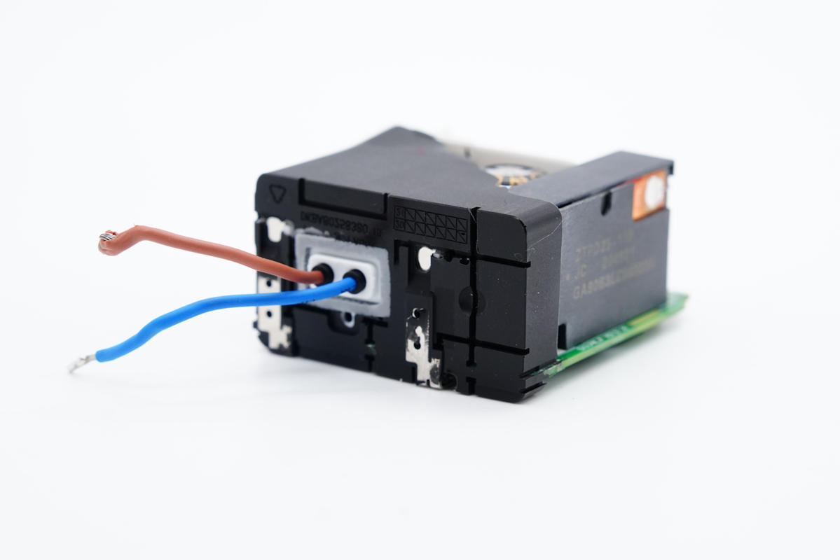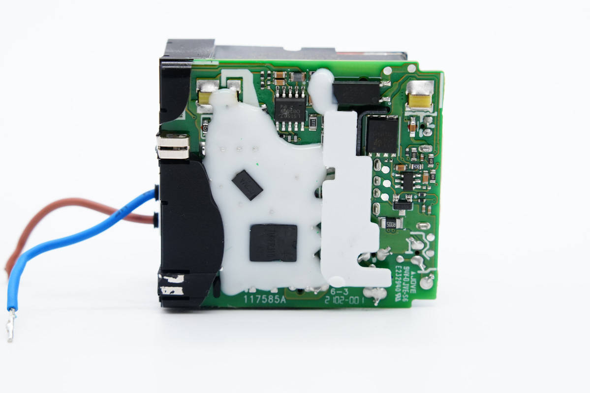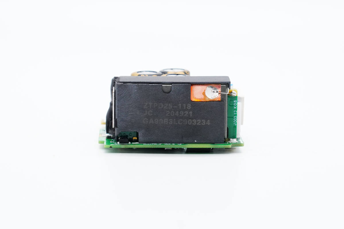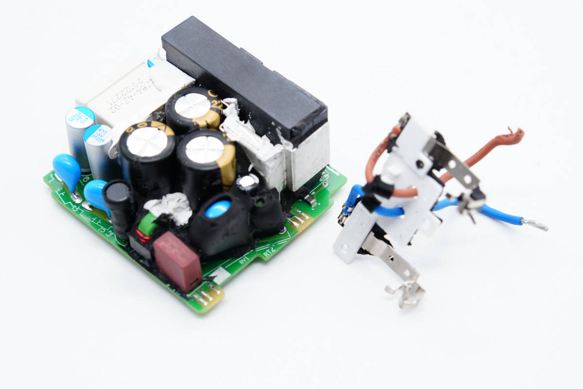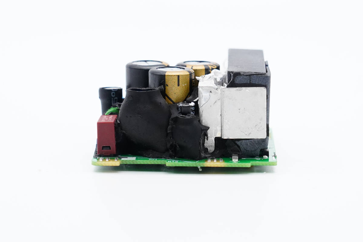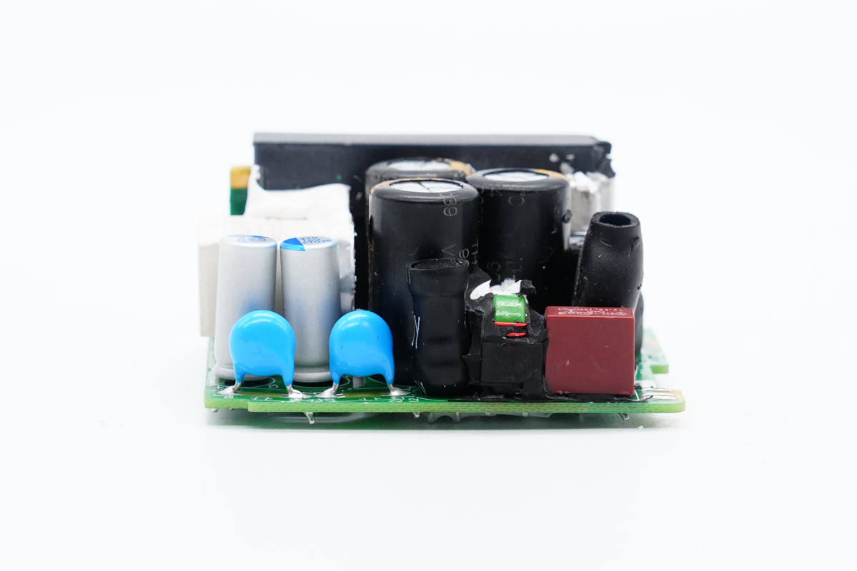 PCB板側面一覽,保險絲左側設有共模電感和工字電感。