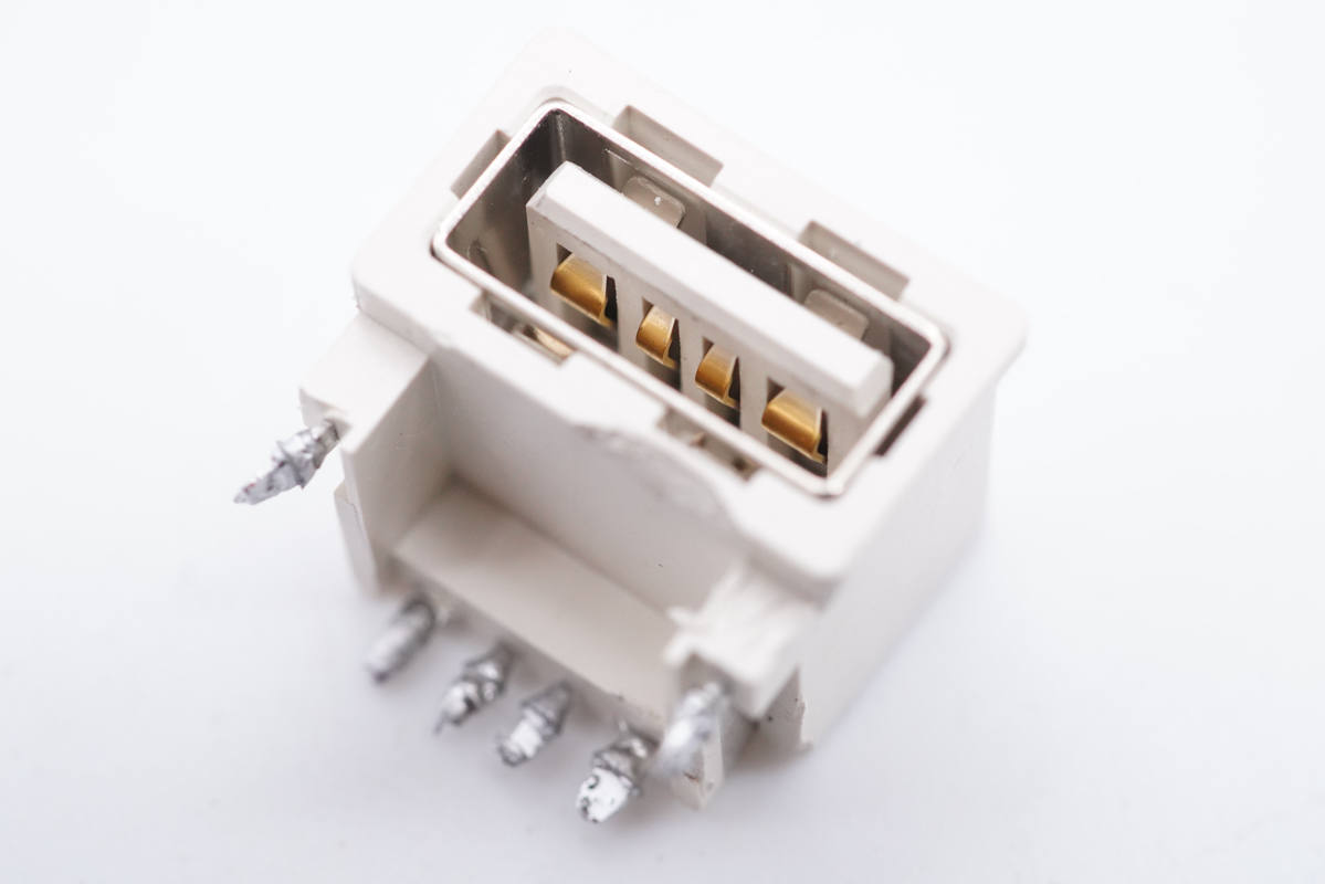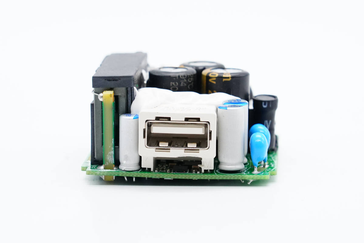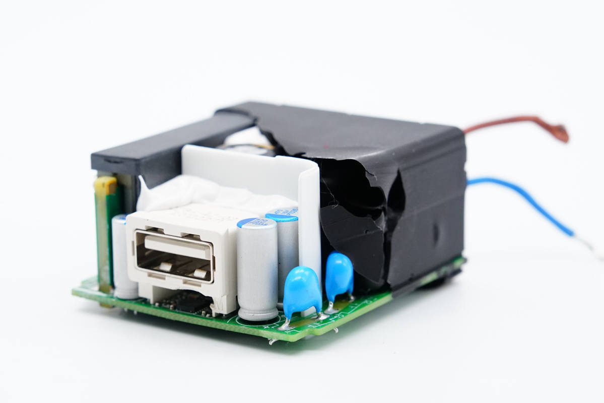 輸出端USB母座外套塑料殼加固防塵,初次級之間有白色塑料板進行隔離。