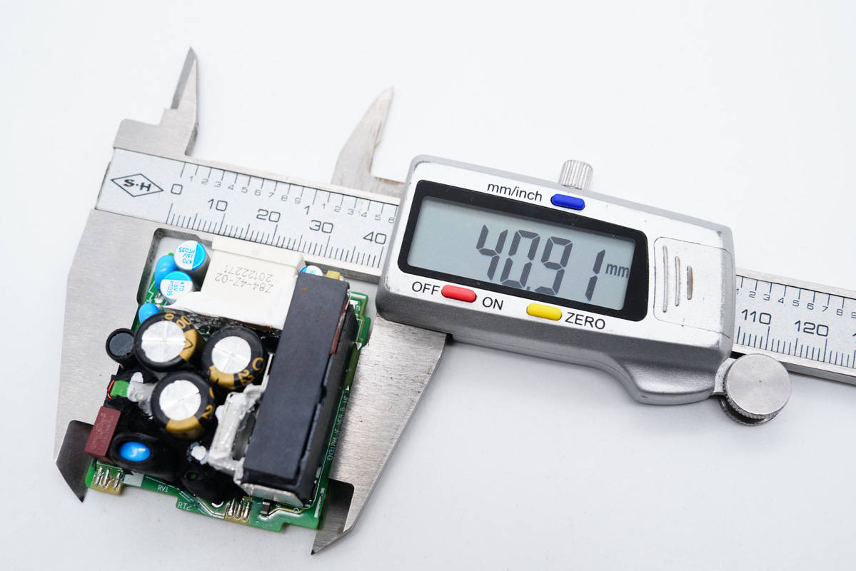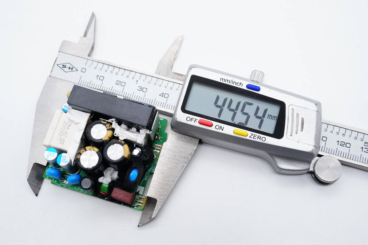 使用游標卡尺測得充電器主板長度為44.54mm。