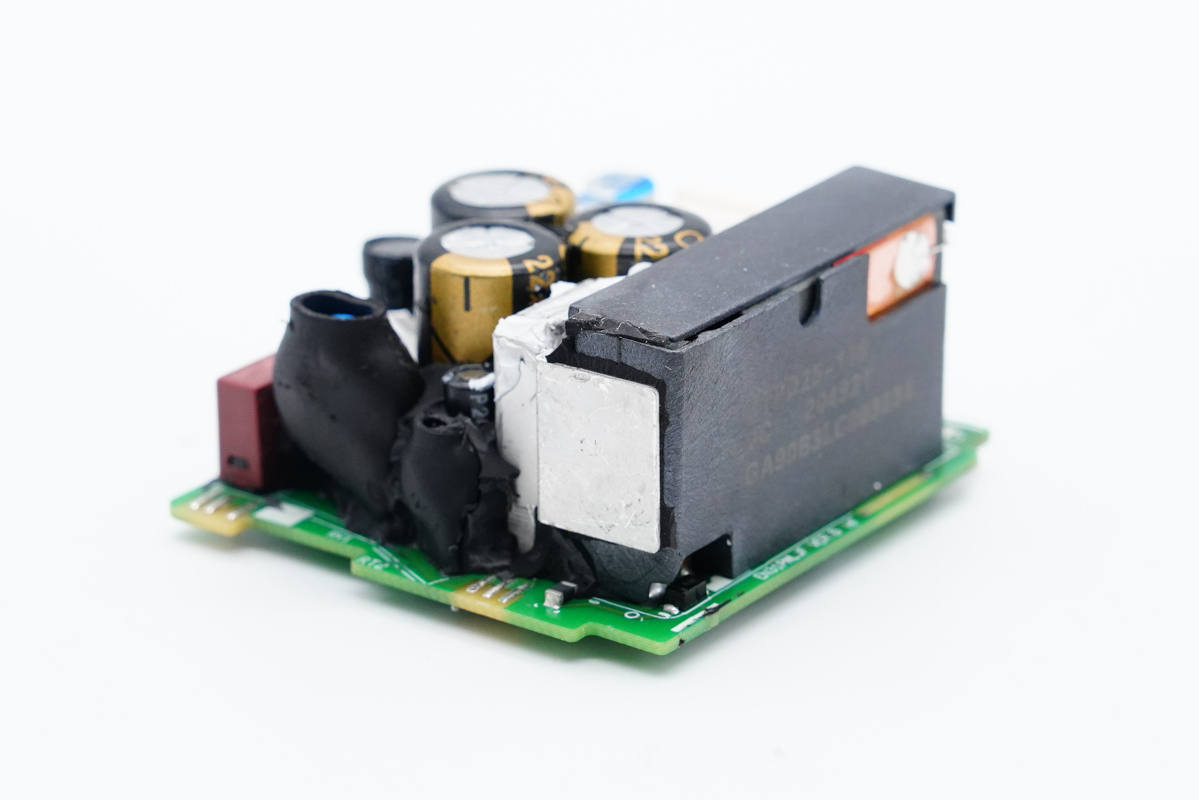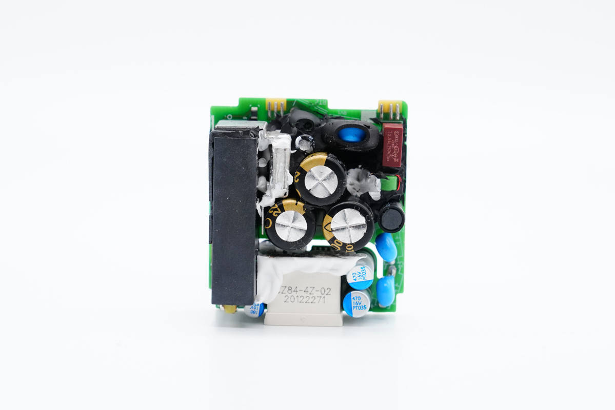 初級開關管配有專門的散熱片,左側設有主控芯片供電電容,右側焊接平面變壓器。
