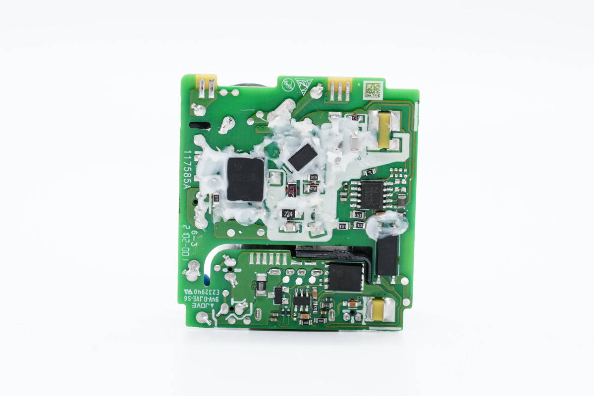 輸出端一覽,母座下方設有協議芯片和輸出VBUS開關管,兩側設有固態電容和Y電容。