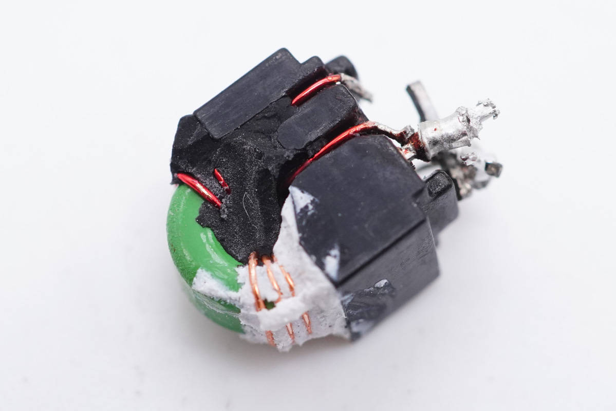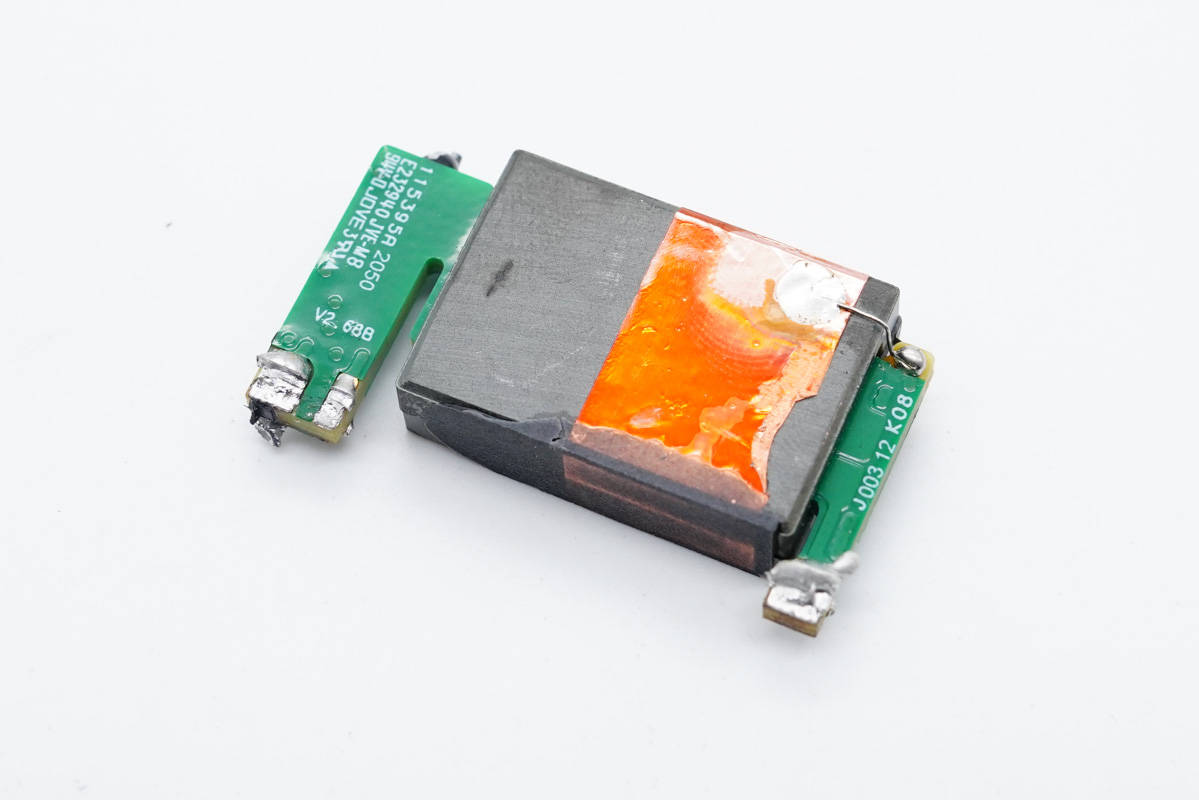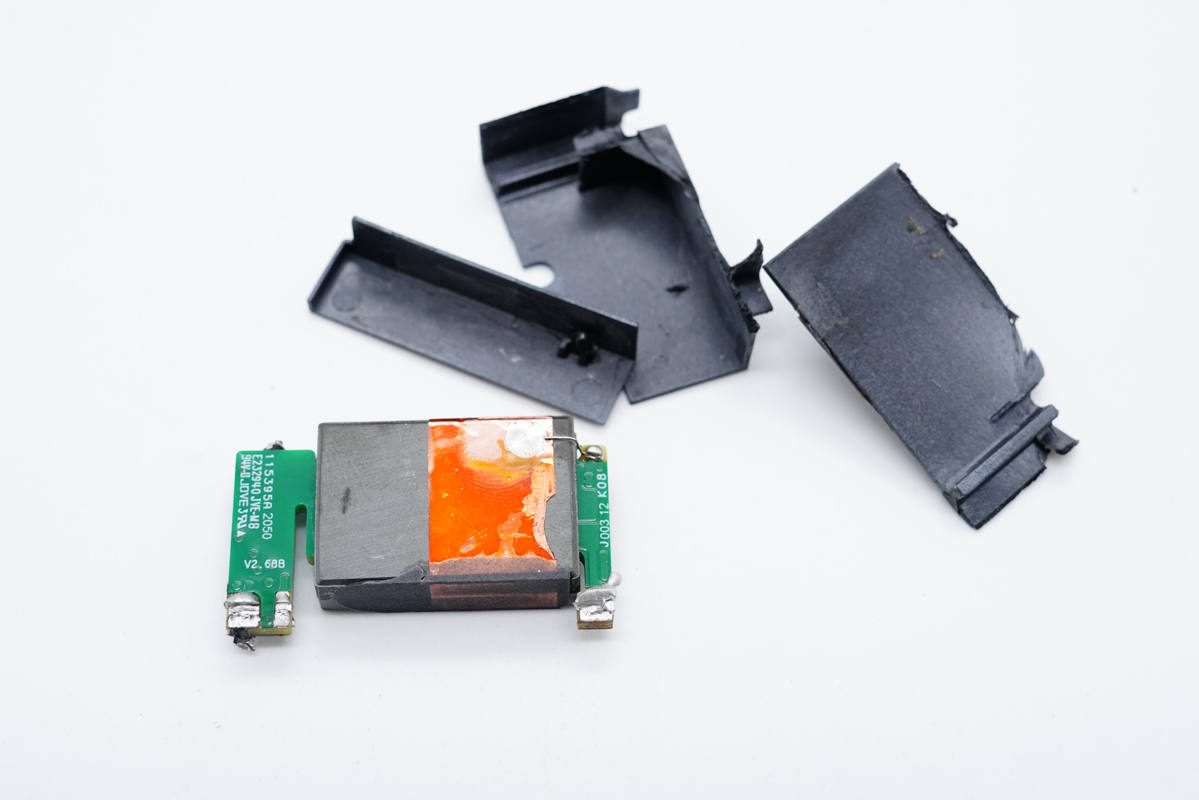 磁芯敲碎一覽,內部是平面線圈,印刷在PCB上。