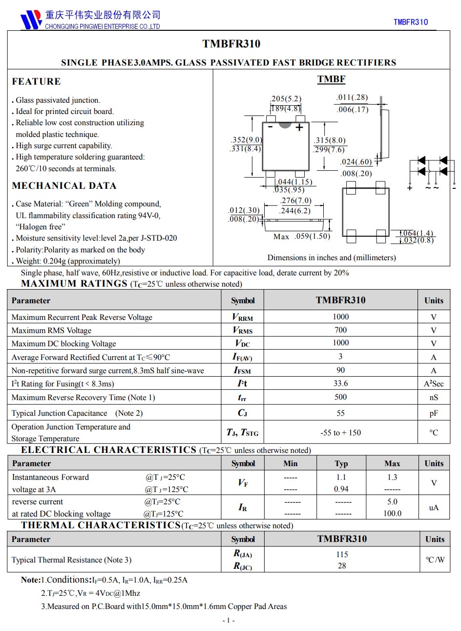 重慶平偉 TMBFR310整流橋特寫,最高工作溫度150℃,最大浪涌電流90A。
