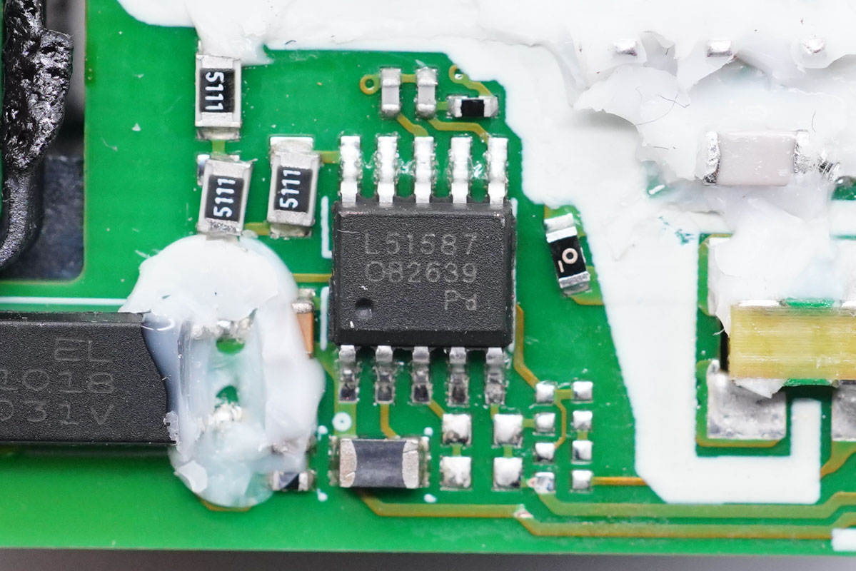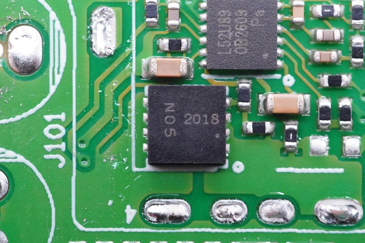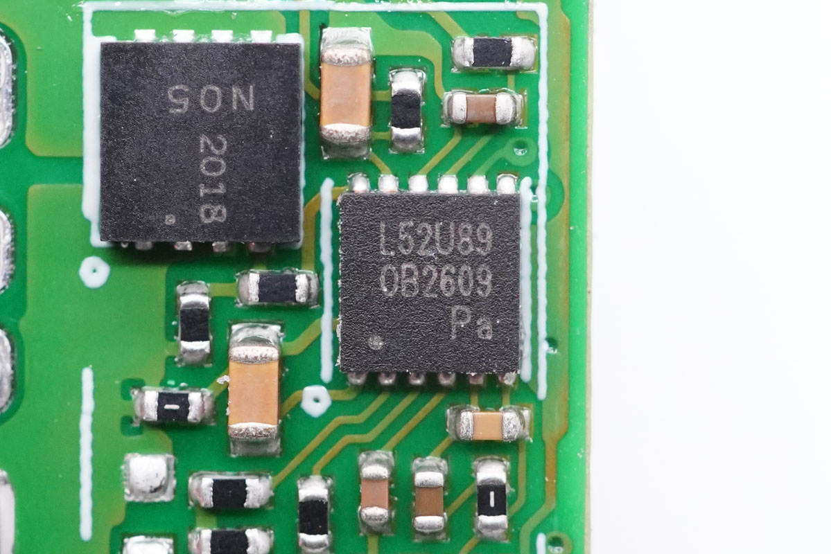 充電頭網通過拆解發現,兩個AC插孔的導電銅片采用一體設計,和導線過孔焊接很牢固。充電器模塊外套塑料殼隔離保護,輸入端注膠加固和導熱,輸出端USB母座外套塑料殼防塵加固,細節講究。充電器采用了昂寶OB2639+OB2019+OB2609全套定制快充方案,搭配意法和UBIQ高低壓MOS管,平偉整流橋,采用豐賓電容進行濾波,用料扎實可靠。