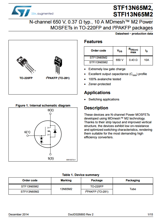 初級開關MOS管采用ST意法半導體STF13N65M2,耐壓650V,導阻0.43Ω。