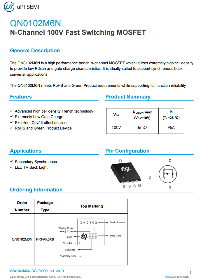 同步整流管采用UBIQ QN0102M6N,NMOS,耐壓100V,導阻6mΩ。