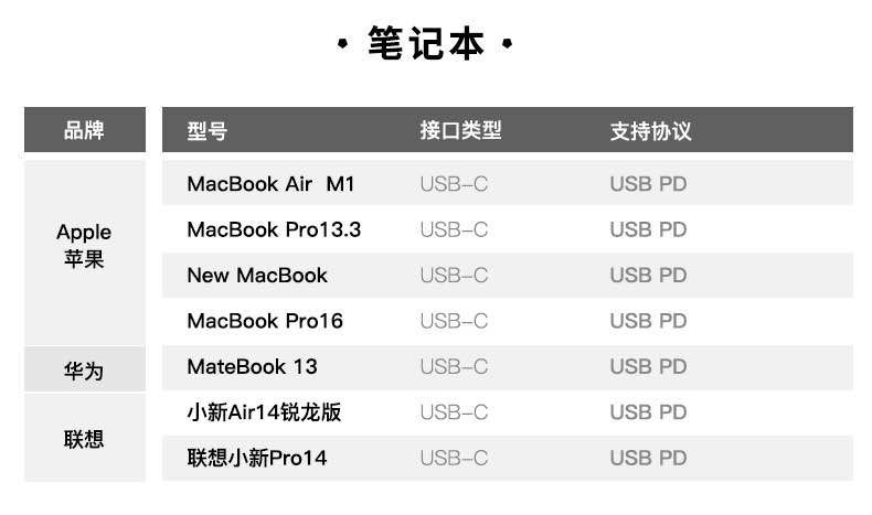 筆電端目前充電頭網評測室共有7臺筆記本電腦,分為蘋果、華為、聯想三個品牌,包括新增的M1處理器MacBook Air。這些筆電都有一個共同點,均配備USB-C物理充電接口且支持USB PD快速充電,這里面充電功率最高的當初MacBook Pro 16了,支持百瓦快充功率,原裝96W充電器也是蘋果首款百瓦級別的USB PD大功率充電器。