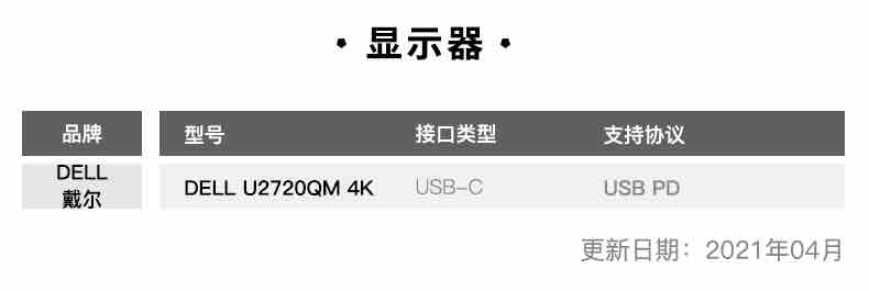 戴爾的U2720QM 4K顯示器,自帶USB-C充電接口,支持90W反向PD快速充電。