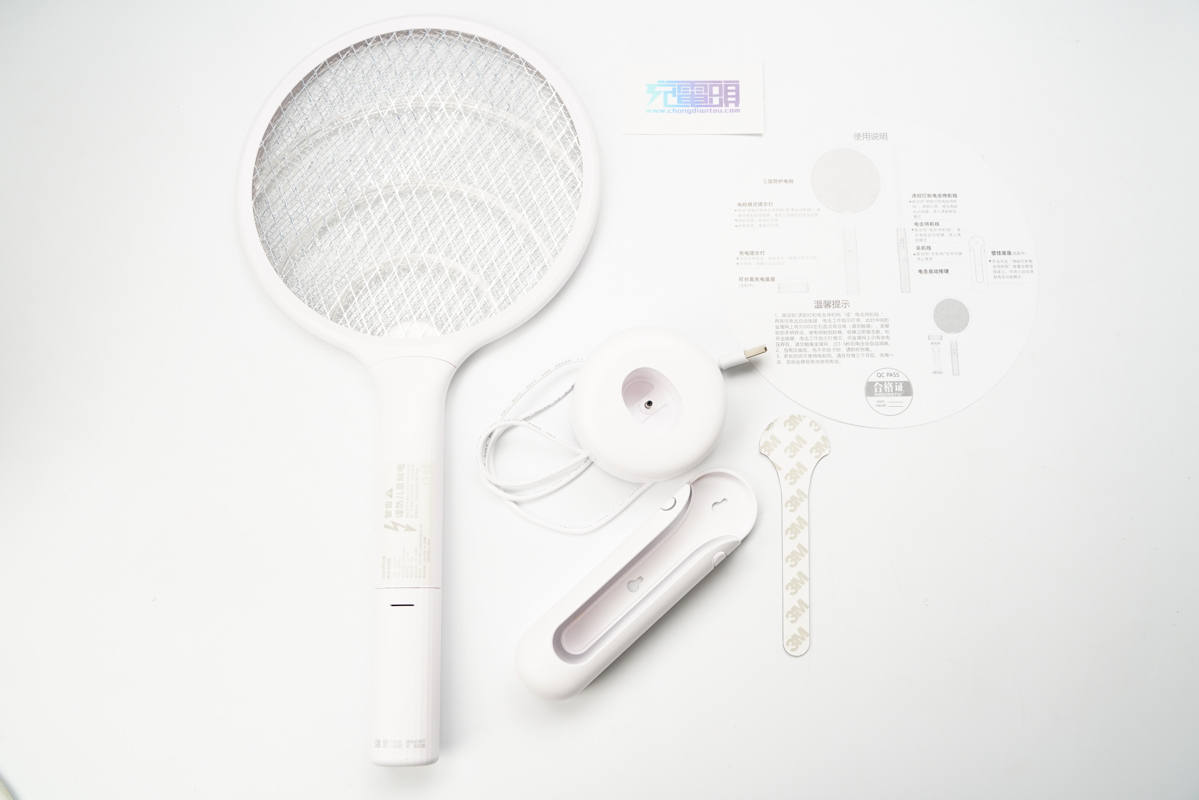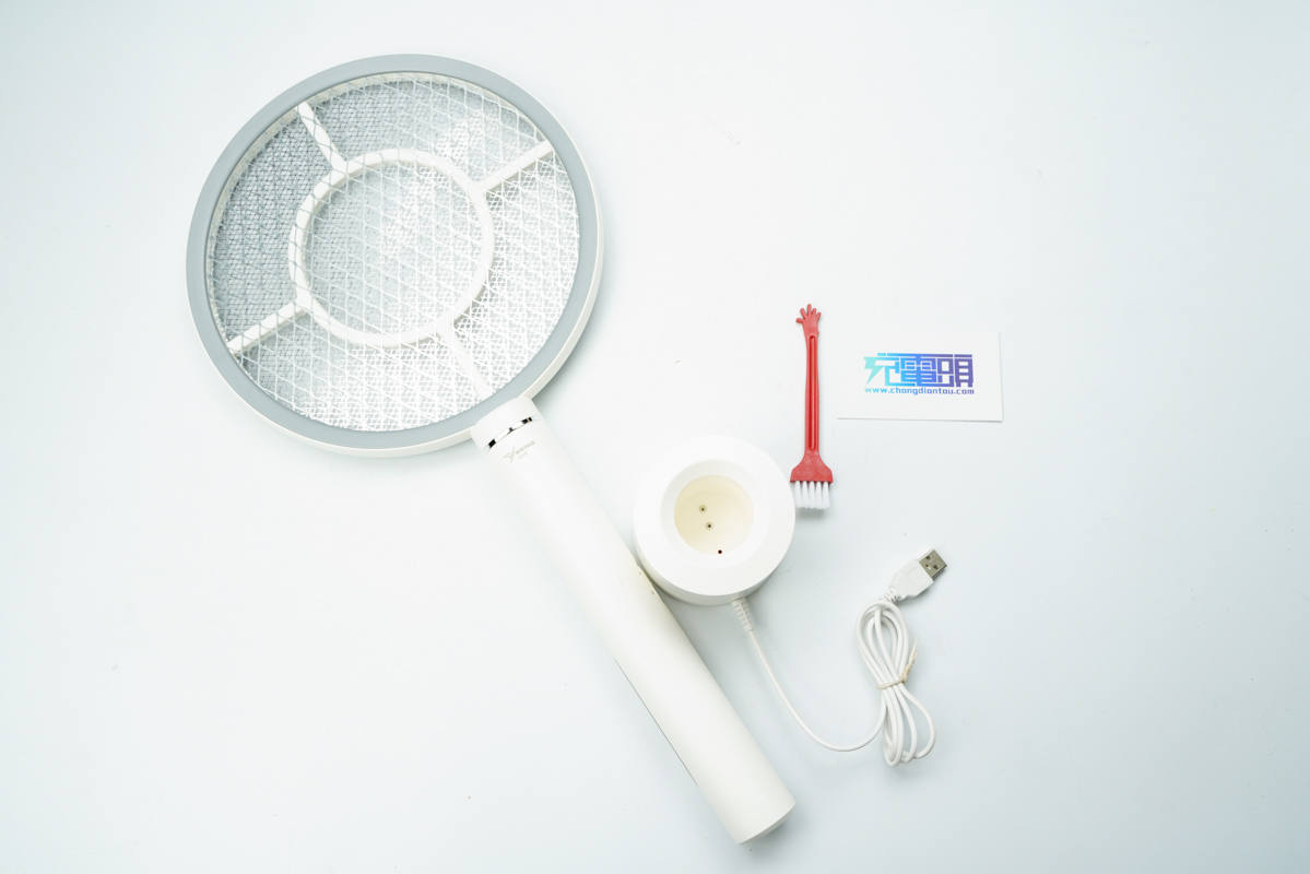 質(zhì)零電蚊拍配有充電底座和掛壁底座以及充電數(shù)據(jù)線,自身外殼為白色,網(wǎng)拍圓形,把手為圓柱設(shè)計,整體外觀簡約大方。把手上設(shè)有開關(guān)鍵、電源鍵以及指示燈等。