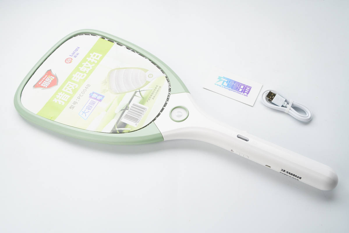 素樂電蚊拍拿在手上,網(wǎng)拍較大,把手較短,使用方便。