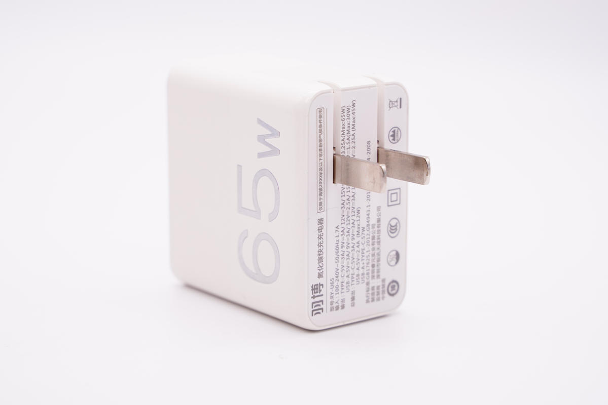 羽博這款65W氮化鎵充電器采用方塊造型設(shè)計(jì),腰身啞光和亮面結(jié)合設(shè)計(jì),各面之間過渡圓潤,正面鑲嵌65W功率字樣亮銀金屬片。